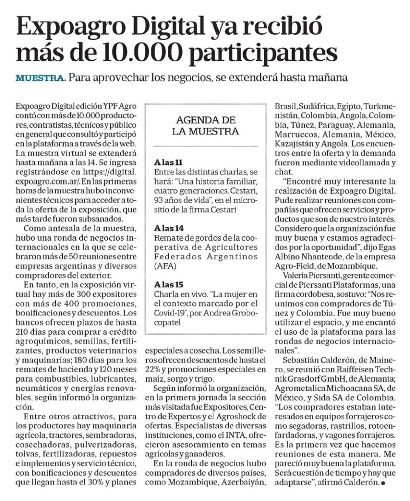 Expoagro Digital edición YPF Agro contó con más de10.000 productores, contratistas, técnicos y público en general que consultó y participó en la plataforma a través de la web. La muestra virtual se extenderá hasta mañana a las 14. Se ingresa registrándose en https://digital. expoagro.com.ar/. En las primeras horas de la muestra hubo inconvenientes técnicos para acceder a toda la oferta de la exposición, que más tarde fueron subsanados.