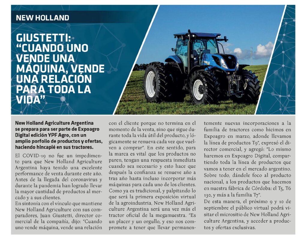 El COVID-19 no fue un impedimento para que New Holland Agriculture Argentina haya tenido una excelente performance de venta durante este año. Antes de la llegada del coronavirus y durante la pandemia han logrado llevar la mayor cantidad de productos al mercado y a sus clientes. En sintonía con el vínculo que mantiene New Holland Agriculture con sus comparadores, Juan Giustetti, director comercial de la compañía, dijo: «Cuando uno vende máquina, vende una relación con el cliente porque no termina en el momento de la venta, sino que sigue durante toda la vida útil del producto, y lógicamente se renueva cada vez que vuelven a comprar”. En este sentido, para la marca es vital que los productos no paren, tengan una respuesta inmediata cuando sea necesario y esto hace que después la confianza se renueve año a tras año hasta incluso incorporar más máquinas para cada uno de los clientes. Como ya es tradicional, y palpitando lo que será la primera exposición virtual de la agroindustria, New Holland Agriculture Argentina será una vez más el tractor oficial de la megamuestra. «Es un placer y un orgullo, y eso nos compromete a tener que llevar permanentemente nuevas incorporaciones a la familia de tractores como hicimos en Expoagro en marzo, adonde llevamos la línea de productos T9”, expresó el director comercial, y agregó: «Lo mismo haremos en Expoagro Digital, compartiendo toda la línea de productos que vamos a tener en el mercado argentino. Sobre todo, dándole foco al producto nacional, a los productos que hacemos en nuestra fábrica de Córdoba: el T5, T6 130, y más a la familia T7”. De esta manera, el próximo 9 y 10 de septiembre el público virtual podrá visitar el micrositio de New Holland Agriculture Argentina, y acceder a productos y ofertas exclusivas.