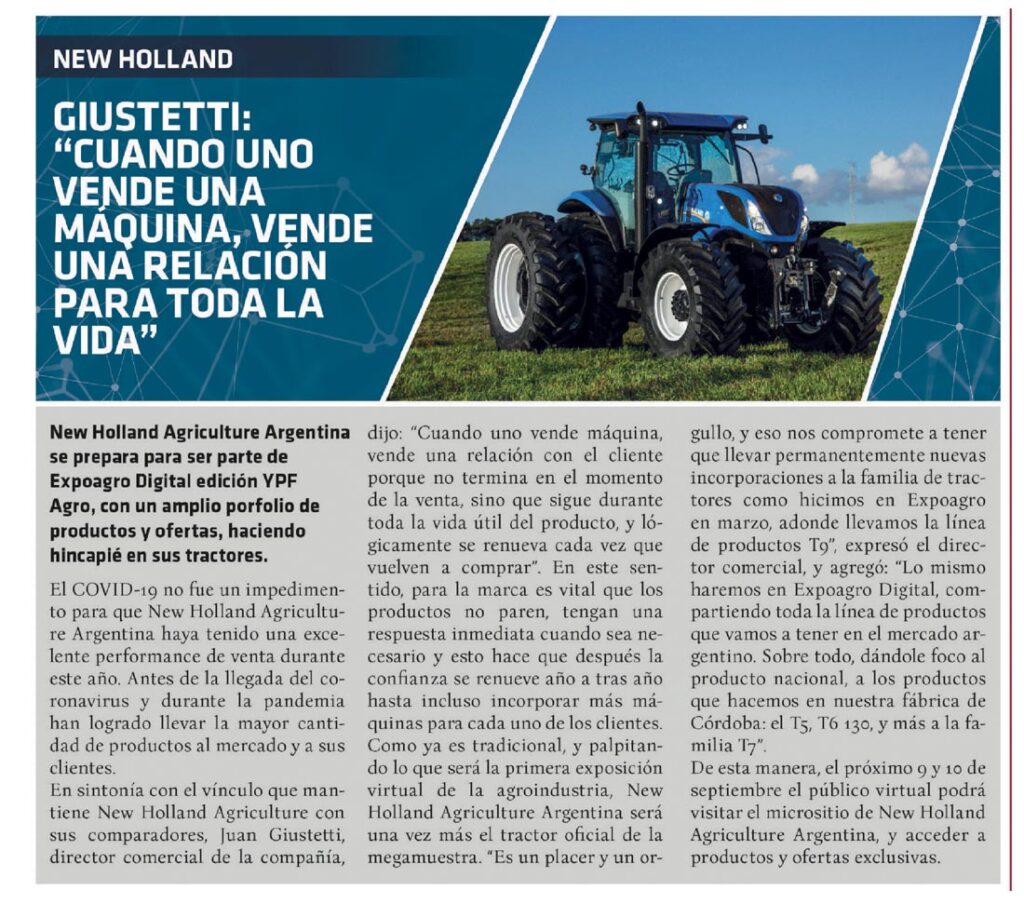 El COVID-19 no fue un impedimento para que New Holland Agriculture Argentina haya tenido una excelente performance de venta durante este año. Antes de la llegada del coronavirus y durante la pandemia han logrado llevar la mayor cantidad de productos al mercado y a sus clientes. En sintonía con el vínculo que mantiene New Holland Agriculture con sus comparadores, Juan Giustetti, director comercial de la compañía, dijo: «Cuando uno vende máquina, vende una relación con el cliente porque no termina en el momento de la venta, sino que sigue durante toda la vida útil del producto, y lógicamente se renueva cada vez que vuelven a comprar». En este sentido, para la marca es vital que los productos no paren, tengan una respuesta inmediata cuando sea necesario y esto hace que después la confianza se renueve año a tras año hasta incluso incorporar más máquinas para cada uno de los clientes. Como ya es tradicional, y palpitando lo que será la primera exposición virtual de la agroindustria, New Holland Agriculture Argentina será una vez más el tractor oficial de la megamuestra. «Es un placer y un orgullo, y eso nos compromete a tener que llevar permanentemente nuevas incorporaciones a la familia de tractores como hicimos en Expoagro en marzo, adonde llevamos la línea de productos T9″, expresó el director comercial, y agregó: «Lo mismo haremos en Expoagro Digital, compartiendo toda la línea de productos que vamos a tener en el mercado argentino. Sobre todo, dándole foco al producto nacional, a los productos que hacemos en nuestra fábrica de Córdoba: el T5, T6 130, y más a la familia T7″. De esta manera, el próximo 9 y 10 de septiembre el público virtual podrá visitar el micrositio de New Holland Agriculture Argentina, y acceder a productos y ofertas exclusivas.