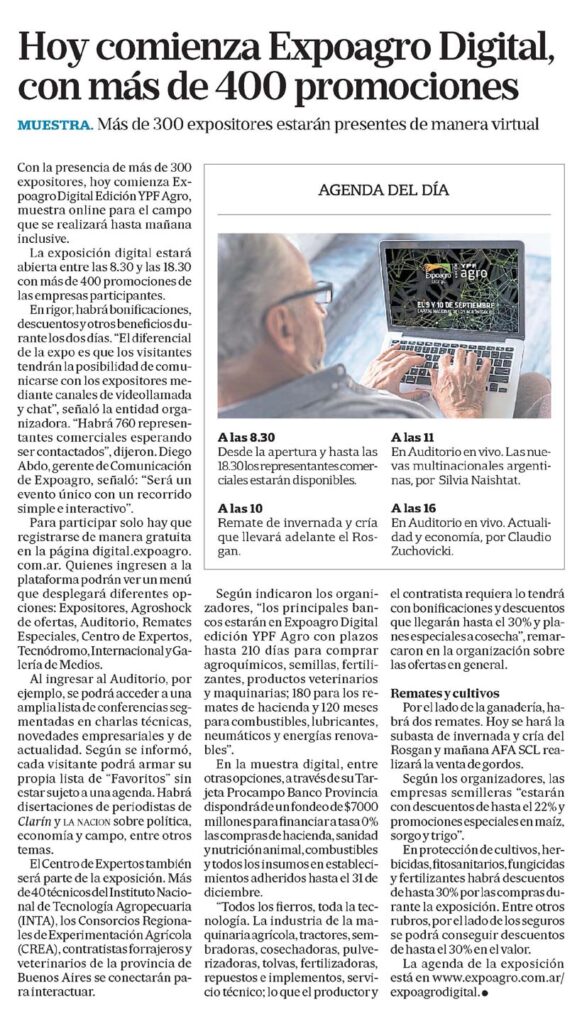 En rigor, habrá bonificaciones, descuentos y otros beneficios durante los dos días. “El diferencial de la expo es que los visitantes tendrán la posibilidad de comunicarse con los expositores mediante canales de videollamada y chat”, señaló la entidad organizadora. “Habrá 760 representantes comerciales esperando ser contactados”, dijeron. Diego Abdo, gerente de Comunicación de Expoagro, señaló: “Será un evento único con un recorrido simple e interactivo”.