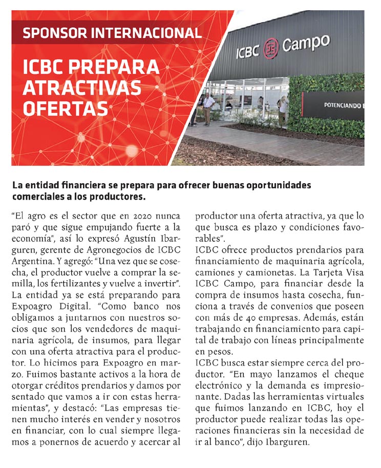 «El agro es el sector que en 2020 nunca paró y que sigue empujando fuerte a la economía”, así lo expresó Agustín Ibarguren, gerente de Agronegocios de ICBC Argentina. Y agregó: «Una vez que se cosecha, el productor vuelve a comprar la semilla, los fertilizantes y vuelve a invertir”. La entidad ya se está preparando para Expoagro Digital. «Como banco nos obligamos a juntarnos con nuestros socios que son los vendedores de maquinaria agrícola, de insumos, para llegar con una oferta atractiva para el productor. Lo hicimos para Expoagro en marzo. Fuimos bastante activos a la hora de otorgar créditos prendarios y damos por sentado que vamos a ir con estas herramientas”, y destacó: «Las empresas tienen mucho interés en vender y nosotros en financiar, con lo cual siempre llegamos a ponernos de acuerdo y acercar al productor una oferta atractiva, ya que lo que busca es plazo y condiciones favorables”. ICBC ofrece productos prendarios para financiamiento de maquinaria agrícola, camiones y camionetas. La Tarjeta Visa ICBC Campo, para financiar desde la compra de insumos hasta cosecha, funciona a través de convenios que poseen con más de 40 empresas. Además, están trabajando en financiamiento para capital de trabajo con líneas principalmente en pesos. ICBC busca estar siempre cerca del productor. «En mayo lanzamos el cheque electrónico y la demanda es impresionante. Dadas las herramientas virtuales que fuimos lanzando en ICBC, hoy el productor puede realizar todas las operaciones financieras sin la necesidad de ir al banco”, dijo Ibarguren.