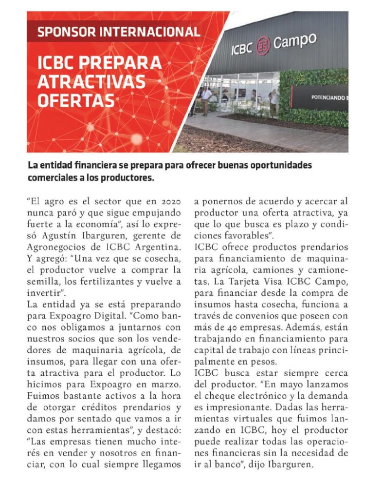 «El agro es el sector que en 2020 nunca paró y que sigue empujando fuerte a la economía», así lo expresó Agustín Ibarguren, gerente de Agronegocios de ICBC Argentina. Y agregó: «Una vez que se cosecha, el productor vuelve a comprar la semilla, los fertilizantes y vuelve a invertir». La entidad ya se está preparando para Expoagro Digital. «Como banco nos obligamos a juntarnos con nuestros socios que son los vendedores de maquinaria agrícola, de insumos, para llegar con una oferta atractiva para el productor. Lo hicimos para Expoagro en marzo. Fuimos bastante activos a la hora de otorgar créditos prendarios y damos por sentado que vamos a ir con estas herramientas», y destacó: «Las empresas tienen mucho interés en vender y nosotros en financiar, con lo cual siempre llegamos a ponernos de acuerdo y acercar al productor una oferta atractiva, ya que lo que busca es plazo y condiciones favorables». ICBC ofrece productos prendarios para financiamiento de maquinaria agrícola, camiones y camionetas. La Tarjeta Visa ICBC Campo, para financiar desde la compra de insumos hasta cosecha, funciona a través de convenios que poseen con más de 40 empresas. Además, están trabajando en financiamiento para capital de trabajo con líneas principalmente en pesos. ICBC busca estar siempre cerca del productor. «En mayo lanzamos el cheque electrónico y la demanda es impresionante. Dadas las herramientas virtuales que fuimos lanzando en ICBC, hoy el productor puede realizar todas las operaciones financieras sin la necesidad de ir al banco», dijo Ibarguren.