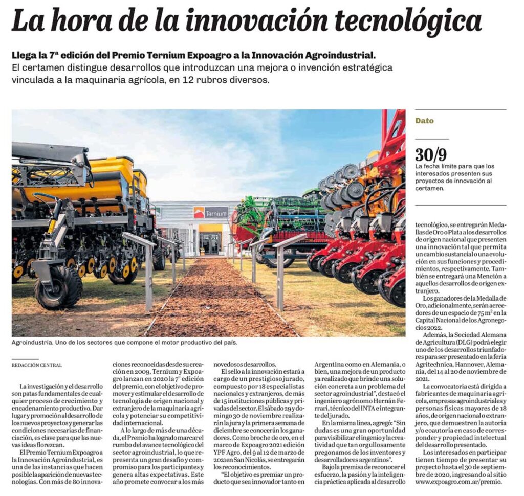 El Premio Ternium Expoagro a la Innovación Agroindustrial, es una de las instancias que hacen posible la aparición de nuevas tecnologías. Con más de 80 innovaciones reconocidas desde su creación en 2009, Ternium y Expoagro lanzan en 2020 la 7° edición del premio, con el objetivo de promover y estimular el desarrollo de tecnología de origen nacional y extranjero de la maquinaria agrícola y potenciar su competitividad internacional.