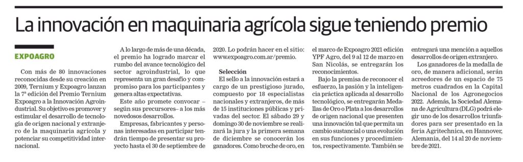 Con más de 80 innovaciones reconocidas desde su creación en 2009, Ternium y Expoagro lanzan la 7ª edición del Premio Ternium Expoagro a la Innovación Agroindustrial. Su objetivo es promover y estimular el desarrollo de tecnología de origen nacional y extranjero de la maquinaria agrícola y potenciar su competitividad internacional.