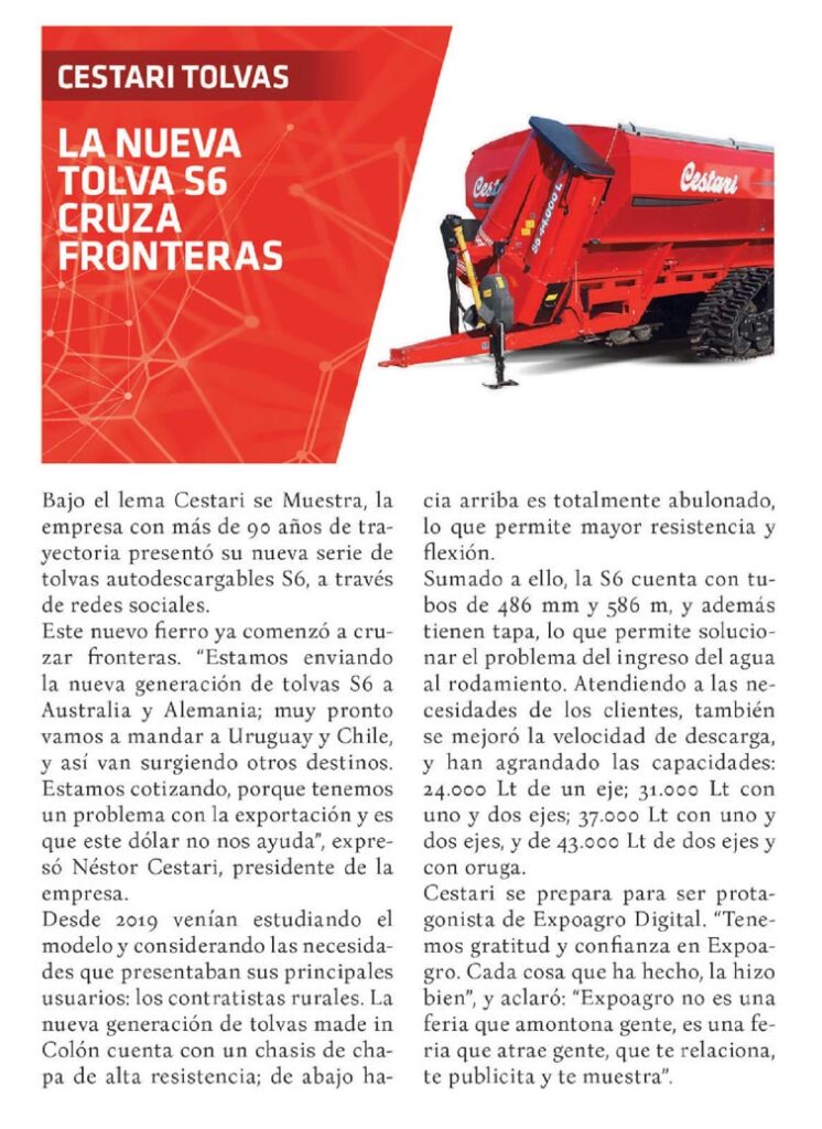Bajo el lema Cestari se Muestra, la empresa con más de 90 años de trayectoria presentó su nueva serie de tolvas autodescargables S6, a través de redes sociales. Este nuevo fierro ya comenzó a cruzar fronteras. «Estamos enviando la nueva generación de tolvas S6 a Australia y Alemania; muy pronto vamos a mandar a Uruguay y Chile, y así van surgiendo otros destinos. Estamos cotizando, porque tenemos un problema con la exportación y es que este dólar no nos ayuda», expresó Néstor Cestari, presidente de la empresa. Desde 2019 venían estudiando el modelo y considerando las necesidades que presentaban sus principales usuarios: los contratistas rurales. La nueva generación de tolvas made in Colón cuenta con un chasis de chapa de alta resistencia; de abajo hacia arriba es totalmente abulonado, lo que permite mayor resistencia y flexión. Sumado a ello, la S6 cuenta con tubos de 486 mm y 586 m, y además tienen tapa, lo que permite solucionar el problema del ingreso del agua al rodamiento. Atendiendo a las necesidades de los clientes, también se mejoró la velocidad de descarga, y han agrandado las capacidades: 24.000 Lt de un eje; 31.000 Lt con uno y dos ejes; 37.000 Lt con uno y dos ejes, y de 43.000 Lt de dos ejes y con oruga. Cestari se prepara para ser protagonista de Expoagro Digital. «Tenemos gratitud y confianza en Expoagro. Cada cosa que ha hecho, la hizo bien», y aclaró: «Expoagro no es una feria que amontona gente, es una feria que atrae gente, que te relaciona, te publicita y te muestra».
