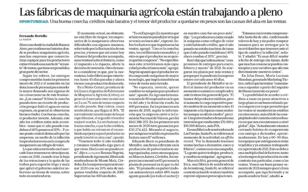 “Tenemos todo el año vendido y estamos vendiendo algo para el que viene. Hacía rato no pasaba esto”, dijo a la nación Rosana Negrini, presidenta de Agrometal, fábrica de sembradoras de Monte Maíz, Córdoba. En la empresa esperan terminar 2020 con un 20% más de máquinas vendidas respecto de 2019. Superarían las 400 unidades.