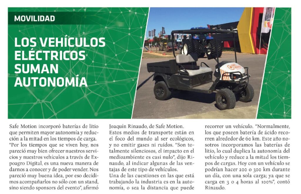 Safe Motion incorporó baterías de litio que permiten mayor autonomía y reducción a la mitad en los tiempos de carga. «Por los tiempos que se viven hoy, nos pareció muy bien ofrecer nuestros servicios y nuestros vehículos a través de Expoagro Digital, es una nueva manera de darnos a conocer y de poder vender. Nos pareció muy buena idea, por eso decidimos acompañarlos no sólo con un stand, sino siendo sponsors del evento», afirmó Joaquín Rinaudo, de Safe Motion. Estos medios de transporte están en el foco del mundo al ser ecológicos, y no emitir gases ni ruidos. «Son totalmente silenciosos, el impacto en el medioambiente es casi nulo», dijo Rinaudo, al indicar algunas de las ventajas de este tipo de vehículos.