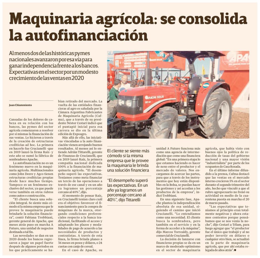 Cansadas de los dolores de cabeza en su relación con los bancos, las pymes del sector agrícola comenzaron a resolver por sí mismas la financiación de sus ventas. Lo hicieron a través de la creación de estructuras crediticias ad hoc. La primera en hacerlo fue Crucianelli -que en 2019 lanzó la firma Raíz- y este año se sumó la fábrica de sembradores Apache.