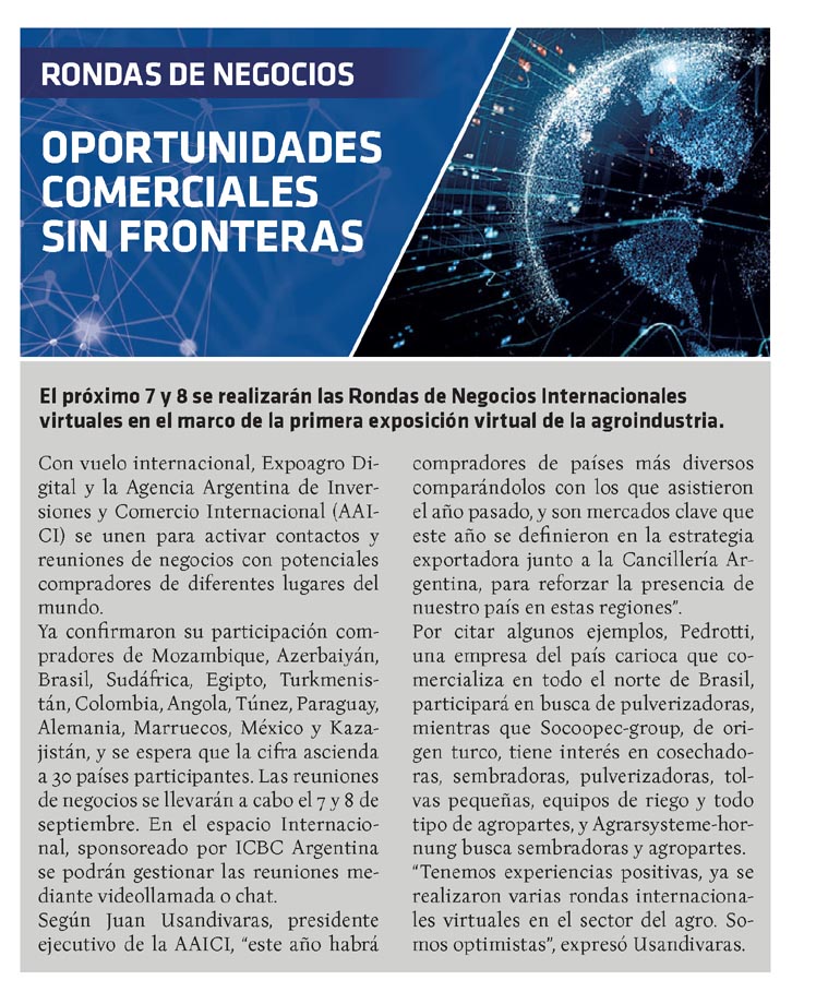 Con vuelo internacional, Expoagro Digital y la Agencia Argentina de Inversiones y Comercio Internacional (AAICI) se unen para activar contactos y reuniones de negocios con potenciales compradores de diferentes lugares del mundo. Ya confirmaron su participación compradores de Mozambique, Azerbaiyán, Brasil, Sudáfrica, Egipto, Turkmenistán, Colombia, Angola, Túnez, Paraguay, Alemania, Marruecos, México y Kazajistán, y se espera que la cifra ascienda a 30 países participantes. Las reuniones de negocios se llevarán a cabo el 7 y 8 de septiembre. En el espacio Internacional, sponsoreado por ICBC Argentina se podrán gestionar las reuniones mediante videollamada o chat. Según Juan Usandivaras, presidente ejecutivo de la AAICI, «este año habrá compradores de países más diversos comparándolos con los que asistieron el año pasado, y son mercados clave que este año se definieron en la estrategia exportadora junto a la Cancillería Argentina, para reforzar la presencia de nuestro país en estas regiones”. Por citar algunos ejemplos, Pedrotti, una empresa del país carioca que comercializa en todo el norte de Brasil, participará en busca de pulverizadoras, mientras que Socoopec-group, de origen turco, tiene interés en cosechadoras, sembradoras, pulverizadoras, tolvas pequeñas, equipos de riego y todo tipo de agropartes, y Agrarsysteme-hornung busca sembradoras y agropartes. «Tenemos experiencias positivas, ya se realizaron varias rondas internacionales virtuales en el sector del agro. Somos optimistas”, expresó Usandivaras.