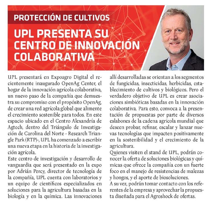 UPL presentará en Expoagro Digital el recientemente inaugurado OpenAg Center, el hogar de la innovación agrícola colaborativa, un nuevo paso de la compañía que demuestra su compromiso con el propósito OpenAg, de crear una red agrícola global que alimente el crecimiento sostenible para todos. En este espacio ubicado en el Centro Alexandría de Agtech, dentro del Triángulo de Investigación de Carolina del Norte – Research Triangle Park (RTP)-, UPL ha comenzado a escribir una nueva etapa en la historia de la investigación agrícola.