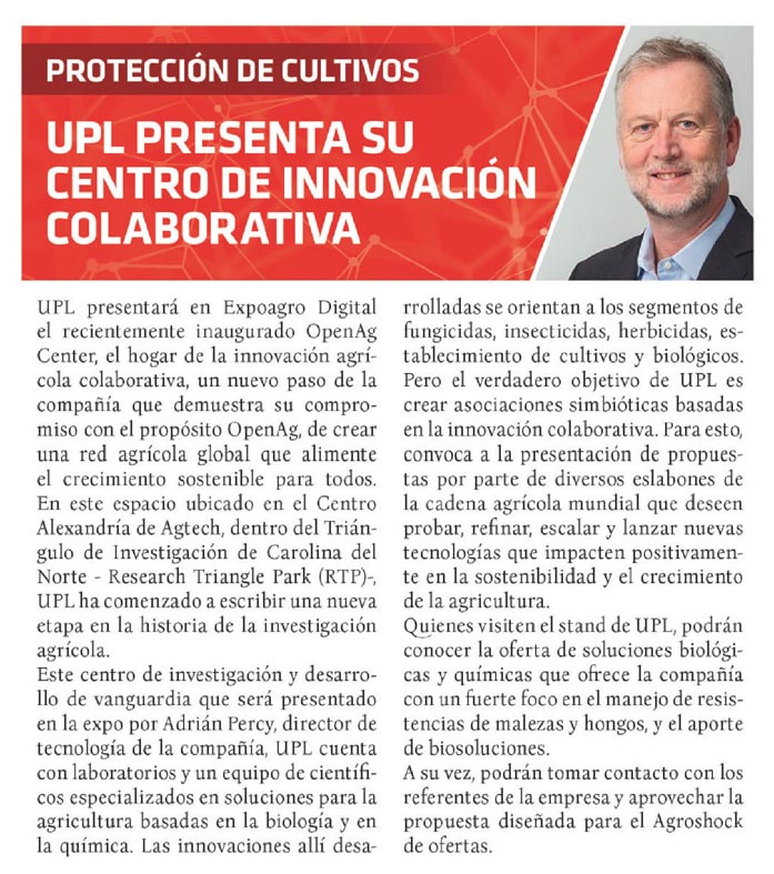 UPL presentará en Expoagro Digital el recientemente inaugurado OpenAg Center, el hogar de la innovación agrícola colaborativa, un nuevo paso de la compañía que demuestra su compromiso con el propósito OpenAg, de crear una red agrícola global que alimente el crecimiento sostenible para todos. En este espacio ubicado en el Centro Alexandría de Agtech, dentro del Triángulo de Investigación de Carolina del Norte – Research Triangle Park (RTP)-, UPL ha comenzado a escribir una nueva etapa en la historia de la investigación agrícola.