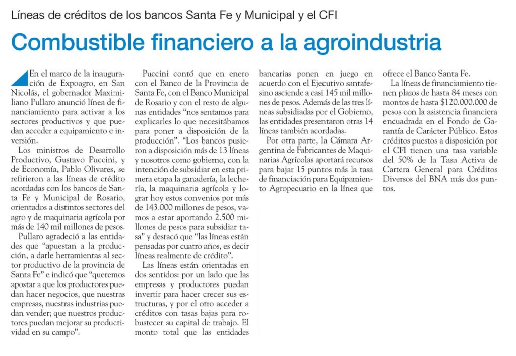 En el marco de la inauguración de Expoagro, en San Nicolás, el gobernador Maximiliano Pullaro anunció línea de financiamiento para activar a los sectores productivos y que puedan acceder a equipamiento e inversión.Los ministros de Desarrollo Productivo, Gustavo Puccini, y de Economía, Pablo Olivares, se refirieron a las líneas de crédito acordadas con los bancos de Santa Fe y Municipal de Rosario, orientados a distintos sectores del agro y de maquinaria agrícola por más de 140 mil millones de pesos.Pullaro agradeció a las entidades que «apuestan a la producción, a darle herramientas al sector productivo de la provincia de Santa Fe» e indicó que «queremos apostar a que los productores puedan hacer negocios, que nuestras empresas, nuestras industrias puedan vender; que nuestros productores puedan mejorar su productividad en su campo».Puccini contó que en enero con el Banco de la Provincia de Santa Fe, con el Banco Municipal de Rosario y con el resto de algunas entidades «nos sentamos para explicarles lo que necesitábamos para poner a disposición de la producción». «Los bancos pusieron a disposición más de 13 líneas y nosotros como gobierno, con la intención de subsidiar en esta primera etapa la ganadería, la lechería, la maquinaria agrícola y lograr hoy estos convenios por más de 143.000 millones de pesos, vamos a estar aportando 2.500 millones de pesos para subsidiar tasa» y destacó que «las líneas están pensadas por cuatro años, es decir líneas realmente de crédito».Las líneas están orientadas en dos sentidos: por un lado que las empresas y productores puedan invertir para hacer crecer sus estructuras, y por el otro acceder a créditos con tasas bajas para robustecer su capital de trabajo. El monto total que las entidades bancarias ponen en juego en acuerdo con el Ejecutivo santafesino asciende a casi 145 mil millones de pesos. Además de las tres líneas subsidiadas por el Gobierno, las entidades presentaron otras 14 líneas también acordadas.Por otra parte, la Cámara Argentina de Fabricantes de Maquinarias Agrícolas aportará recursos para bajar 15 puntos más la tasa de financiación para Equipamiento Agropecuario en la línea que ofrece el Banco Santa Fe.La líneas de financiamiento tienen plazos de hasta 84 meses con montos de hasta $120.000.000 de pesos con la asistencia financiera encuadrada en el Fondo de Garantía de Carácter Público. Estos créditos puestos a disposición por el CFI tienen una tasa variable del 50% de la Tasa Activa de Cartera General para Créditos Diversos del BNA más dos puntos.