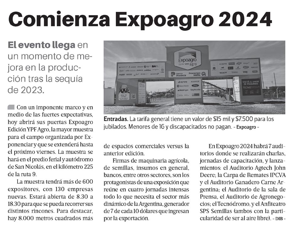 Comienza Expoagro 2024El evento llega en un momento de mejora en la producción tras la sequía de 2023.2 Con un imponente marco y en medio de las fuertes expectativas, hoy abrirá sus puertas Expoagro Edición YPF Agro, la mayor muestra para el campo organizada por Ex Ponenciar y que se extenderá hasta el próximo viernes. La muestra se hará en el predio ferial y autódromo de San Nicolás, en el kilómetro 225 de la ruta 9.La muestra tendrá más de 600 expositores, con 130 empresas nuevas, Estará abierta de 8.30 a 18.30 para que se pueda recorrer sus distintos rincones. Para destacar, hay 8.000 metros cuadrados másEntradas. La tarifa general tiene un valor de $15 mil y 57.500 para loubilados. Menores de 16 y discapacitados no pagan. – Expoagro -de espacios comerciales versus la anterior edición.Firmas de maquinaria agrícola, de semillas, insumos en general, bancos, entre otros sectores, son los protagonistas de una exposición que reúne en cuatro jornadas intensas todo lo que necesita el sector más dinámico de la Argentina, generador de7 de cada 10 dólares que ingresan por la exportación.EnExpoagro 2024 habrá7 auditorios donde se realizarán charlas, jornadas de capacitación, y lanzamientos: el Auditorio Agtech John Deere; la Carpa de Remates IPCVA y el Auditorio Ganadero Carne Ar gentina; el Auditorio de la sala de Prensa, el Auditorio de Agronegocios; el Tecnódromo, y el Anfiteatro SPS Semillas (ambos con la partiCularidad de ser al aire libre). – DIB