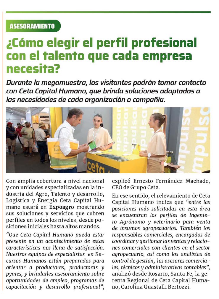 Con amplia cobertura a nivel nacional y con unidades especializadas en la industria del Agro, Talento y desarrollo, Logística y Energía Ceta Capital Humano estará en Expoagro mostrando sus soluciones y servicios que cubren perfiles en todos los niveles, desde posiciones iniciales hasta altos mandos.