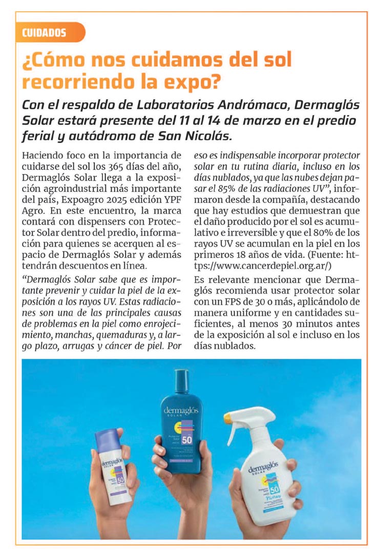 ¿Cómo nos cuidamos del sol recorriendo la expo? Con el respaldo de Laboratorios Andrómaco, Dermaglós Solar estará presente del 11 al 74 de marzo en el predio ferial y autódromo de San Nicolás.