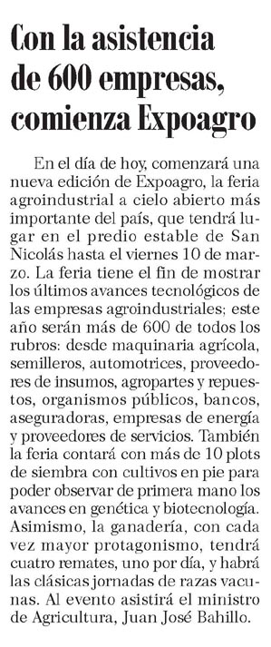 En el día de hoy, comenzará una nueva edición de Expoagro, la feria agroindustrial a cielo abierto más importante del país, que tendrá lugar en el predio estable de San Nicolás hasta el viernes 10 de ma zo. La feria tiene el fin de mostrar los últimos avances tecnológicos de las empresas agroindustriales; este año serán más de 600 de todos los rubros: desde maquinaria agrícola, semilleros, automotrices, proveedo1es de insumos, agropartes y repue: tos, organismos públicos, bancos, aseguradoras, empresas de energía y proveedores de servicios. También la feria contará con más de 10 plots de siembra con cultivos en pie para poder observar de primera mano los avances en genética y biotecnología. Asimismo, la ganadería, con cada vez mayor protagonismo, tendrá cuatro remates, uno por día, y habrá las clásicas jornadas de razas vacunas. Al evento asistirá el ministro de Agricultura, Juan José Bahillo.