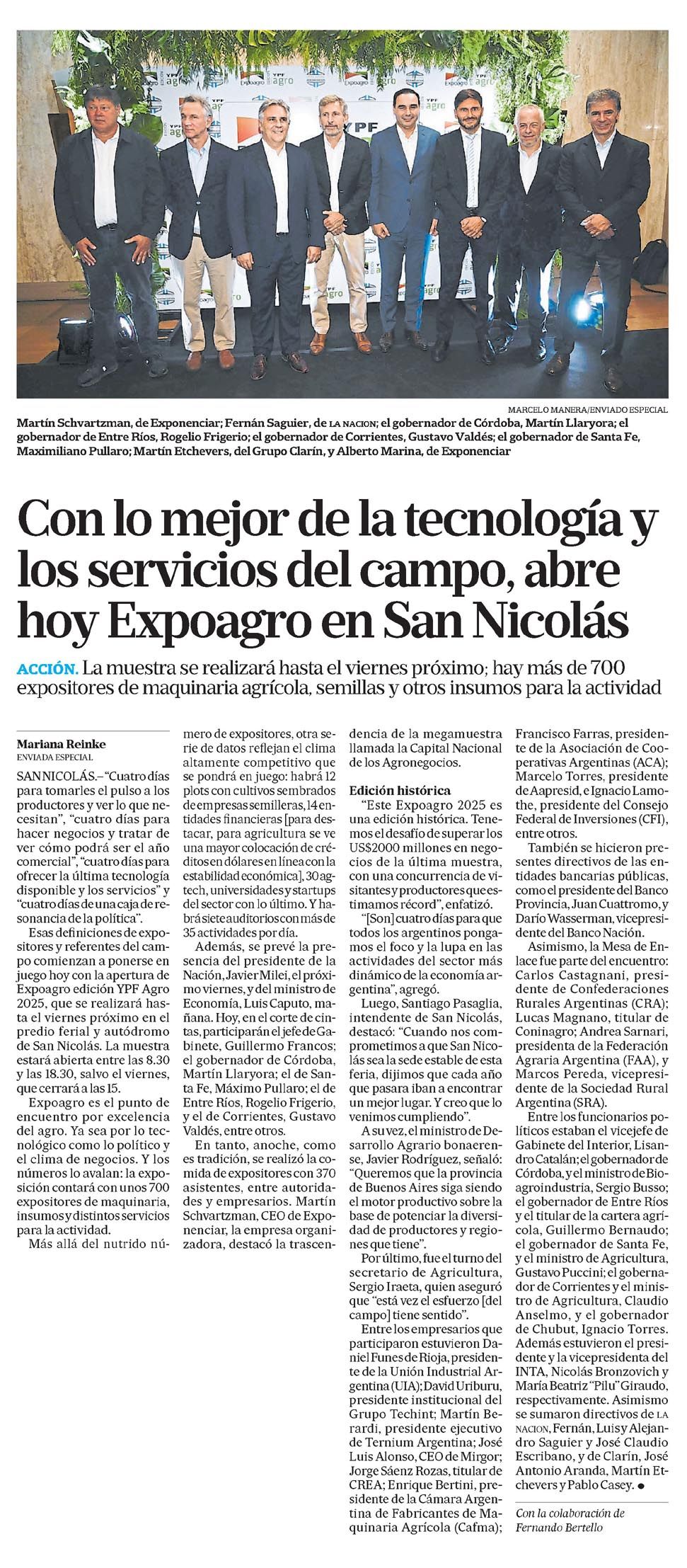 Entre los funcionarios políticos estaban el vicejefe de Gabinete del Interior, Lisan- dro Catalán; el gobernador de Córdoba, y el ministro de Bio- agroindustria, Sergio Busso; el gobernador de Entre Ríos y el titular de la cartera agrícola, Guillermo Bernaudo; el gobernador de Santa Fe, y el ministro de Agricultura, Gustavo Puccini; el gobernador de Corrientes y el ministro de Agricultura, Claudio Anselmo, y el gobernador de Chubut, Ignacio Torres. Además estuvieron el presidente y la vicepresidenta del INTA, Nicolás Bronzovich y María Beatriz «Pilu» Giraudo, respectivamente. Asimismo se sumaron directivos de la nación, Fernán, Luis y Alejandro Saguier y José Claudio Escribano, y de Clarín, José Antonio Aranda, Martín Et- chevers y Pablo Casey. ? Con la colaboración de Fernando Bertello