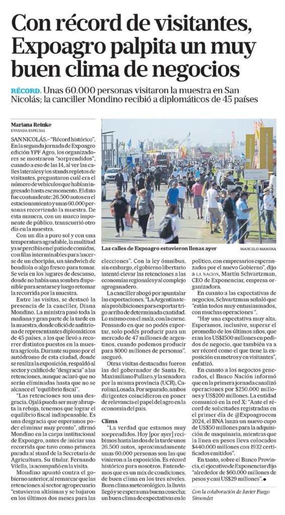 récord. Unas 60.000 personas visitaron la muestra en San Nicolás; la canciller Mondino recibió a diplomáticos de 45 paísesSAN NICOLÁS.? «Récord histórico».En la segunda jornada de Expoagro edición YPF Agro, los organizadores se mostraron «sorprendidos», cuando a eso de las 14, al ver las calles laterales y los stands repletos de visitantes, preguntaron cuál era el número de vehículos que habían ingresado hasta ese momento. El dato fue contundente: 26.500 autos en el estacionamiento y unas 60.000 personas recorriendo la muestra. De esta manera, con un marco imponente de público, transcurrió otro día en la muestra.Con un día a puro sol y con una temperatura agradable, la multitud ya se percibía en el patio de comidas, con filas interminables para hacerse de un choripán, un sándwich de bondiola o algo fresco para tomar.Se veía en los lugares de descanso, donde no había una sombra disponible para sentarse y luego retomar la recorrida por la muestra.Entre las visitas, se destacó la presencia de la canciller, Diana Mondino. La ministra pasó toda la mañana y gran parte de la tarde en la muestra, donde ofició de anfitriona de representantes diplomáticos de 45 países, a los que llevó a recorrer distintos puestos en la muestra agrícola. Durante su paso por el autódromo de esta ciudad, donde se realiza la exposición, respaldó al sector y calificó de «desgracia» a las retenciones, aunque aclaró que no serán eliminadas hasta que no se alcance el «equilibrio fiscal».»Las retenciones son una desgracia.Ojalá pueda ser muy abrupta la rebaja, tenemos que lograr el equilibrio fiscal indispensable. Es una desgracia que esperamos poder eliminar muy pronto», afirmó Mondino en la carpa institucional de Expoagro, antes de iniciar una recorrida que tuvo como primera parada al stand de la Secretaría de Agricultura. Su titular, Fernando Vilella, la acompañó en la visita.Mondino apuntó contra el gobierno anterior, al remarcar que las retenciones al sector agropecuario «estuvieron altísimas y se bajaron en los últimos dos meses para las elecciones». Con la ley ómnibus, sin embargo, el gobierno libertario intentó elevar las retenciones a las economías regionales y al complejo agroganadero.La canciller abogó por apuntalar las exportaciones. «La Argentina tenía prohibiciones para exportar trigo arriba de determinada cantidad.Lo mismo con el maíz, con la carne.Pensando en que no podés exportar, solo podés producir para un mercado de 47 millones de argentinos, cuando podemos producir para 8000 millones de personas», aseguró.Otras visitas destacadas fueron las del gobernador de Santa Fe, Maximiliano Pullaro, y la senadora por la misma provincia (UCR), Carolina Losada. Por separado, ambos dirigentes coincidieron en poner de relevancia el papel del agro en la economía del país.Clima «La verdad que estamos muy sorprendidos. Hoy [por ayer] recibimos hasta las dos de la tarde unos 26.500 autos, aproximadamente unas 60.000 personas son las que vinieron a la exposición. Es récord histórico para nosotros. Entendemos que es un mix de condiciones, de buen clima en los tres niveles.Buen clima meteorológico, la lluvia llegó y se espera una buena cosecha; un buen clima de expectativas en lo político, con empresarios esperanzados por el nuevo Gobierno», dijo a la nacion, Martín Schvartzman, CEO de Exponenciar, empresa organizadora.En cuanto a las expectativas de negocios, Schvartzman señaló que «están todos muy entusiasmados, con muchas operaciones «.»Hay una expectativa muy alta.Esperamos, inclusive, superar el promedio de los últimos años, que eran los US$1500 millones en pedidos de negocio, que también va a ser récord como el que tiene la exposición en metros y en visitantes», enfatizó.En cuanto a los negocios generados, el Banco Nación informó que en la primera jornada canalizó operaciones por $250.000 millones y US$200 millones. La entidad comunicó en la red X: «Ante el récord de solicitudes registradas en el primer día de @Expoagrocom 2024, el BNA lanza un nuevo cupo de US$50 millones para la adquisición de maquinaria, mientras que la línea en pesos lleva colocados $440.000 millones con 1932 certificados emitidos».En tanto, sobre el Banco Provincia, el ejecutivo de Exponenciar dijo «alrededor de $60.000 millones de pesos y casi US$29 millones».Con la colaboración de Javier Fuego SimondetLas calles de Expoagro estuvieron llenas ayerMenciones: ceco1 cfinanE ejesagro 64ne