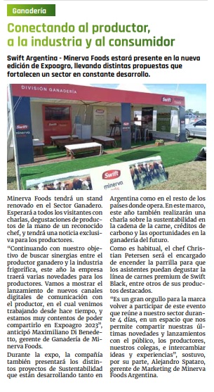 Minerva Foods tendrá un stand renovado en el Sector Ganadero. Esperará a todos los visitantes con charlas, degustaciones de productos de la mano de un reconocido chef, y tendrá una noticia exclusiva para los productores. “Continuando con nuestro objetivo de buscar sinergias entre el productor ganadero y la industria frigorífica, este año la empresa traerá varias novedades para los productores. Vamos a mostrar el lanzamiento de nuevos canales digitales de comunicación con el productor, en el cual venimos trabajando desde hace tiempo, y estamos muy contentos de poder compartirlo en Expoagro 2023”, anticipó Maximiliano Di Benedetto, gerente de Ganadería de Minerva Foods. Durante la expo, la compañía también presentará los distintos proyectos de Sustentabilidad que están desarrollando tanto en Argentina como en el resto de los países donde opera. En este marco, este año también realizarán una charla sobre la sustentabilidad en la cadena de la carne, créditos de carbono y las oportunidades en la ganadería del futuro. Como es habitual, el chef Christian Petersen será el encargado de encender la parrilla para que los asistentes puedan degustar la línea de carnes premium de Swift Black, entre otros de sus productos destacados. “Es un gran orgullo para la marca volver a participar de este evento que reúne a nuestro sector durante 4 días, en un espacio que nos permite compartir nuestras últimas novedades y lanzamientos con el público, los productores, nuestros colegas, e intercambiar ideas y experiencias”, sostuvo, por su parte, Alejandro Spataro, gerente de Marketing de Minerva Foods Argentina.