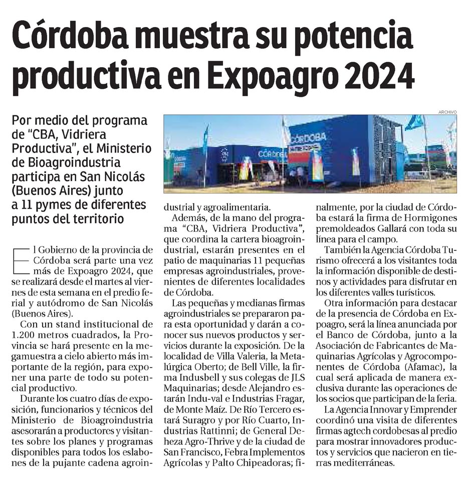 Por medio del programa de «CBA, Vidriera Productiva», el Ministerio de Bioagroindustria participa en San Nicolás (Buenos Aires) junto a 11 pymes de diferentes puntos del territorioEl Gobierno de la provincia de Córdoba será parte una vez más de Expoagro 2024, que se realizará desde el martes al viernes de esta semana en el predio ferial y autódromo de San Nicolás (Buenos Aires).Con un stand institucional de 1.200 metros cuadrados, la Provincia se hará presente en la megamuestra a cielo abierto más importante de la región, para exponer una parte de todo su potencial productivo.Durante los cuatro días de exposición, funcionarios y técnicos del Ministerio de Bioagroindustria asesorarán a productores y visitantes sobre los planes y programas disponibles para todos los eslabones de la pujante cadena agroindustrial y agroalimentaria.Además, de la mano del programa «CBA, Vidriera Productiva», que coordina la cartera bioagroindustrial, estarán presentes en el patio de maquinarias 11 pequeñas empresas agroindustriales, provenientes de diferentes localidades de Córdoba.Las pequeñas y medianas firmas agroindustriales se prepararon para esta oportunidad y darán a conocer sus nuevos productos y servicios durante la exposición. De la localidad de Villa Valeria, la Metalúrgica Oberto; de Bell Ville, la firma Indusbell y sus colegas de JLS Maquinarias; desde Alejandro estarán Indu-val e Industrias Fragar, de Monte Maíz. De Río Tercero estará Suragro y por Río Cuarto, Industrias Rattinni; de General Deheza Agro-Thrive y de la ciudad de San Francisco, Febra Implementos Agrícolas y Palto Chipeadoras; finalmente, por la ciudad de Córdoba estará la firma de Hormigones premoldeados Gallará con toda su línea para el campo.También la Agencia Córdoba Turismo ofrecerá a los visitantes toda la información disponible de destinos y actividades para disfrutar en los diferentes valles turísticos.Otra información para destacar de la presencia de Córdoba en Expoagro, será la línea anunciada por el Banco de Córdoba, junto a la Asociación de Fabricantes de Maquinarias Agrícolas y Agrocomponentes de Córdoba (Afamac), la cual será aplicada de manera exclusiva durante las operaciones de los socios que participan de la feria.La Agencia Innovar y Emprender coordinó una visita de diferentes firmas agtech cordobesas al predio para mostrar innovadores productos y servicios que nacieron en tierras mediterráneas.