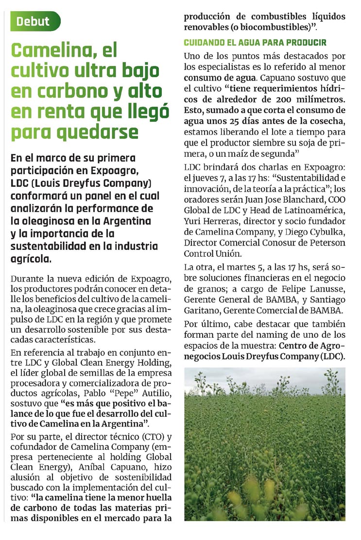 Durante la nueva edición de Expoagro, los productores podrán conocer en deta- llelos beneficios del cultivodelacameli- na, la oleaginosa que crece gracias al impulso de LDC en la región y que promete un desarrollo sostenible por sus destacadas características.