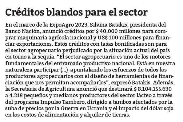 En el marco de la ExpoAgro 2023, Silvina Batakis, presidenta del Banco Nación, anunció créditos por $ 40.000 millones para comprar maquinaria agrícola nacional y US$ 100 millones para financiar exportaciones. Estos créditos con tasas bonificadas son parl sector agropecuario perjudicado por la situación actual del país en torno a la sequía. «El sector agropecuario es uno de los motores fundamentales del entramado productivo nacional. Está en nuestra naturaleza participar (…) apuntalando los esfuerzos de todos los productores agropecuarios con el diseño de herramientas de financiación que nos permitan acompañarlos», expresó Batakis. Además, la Secretaria de Agricultura anunció que destinará $ 8.104.155.630 a 4.318 pequeños y medianos productores del sector lácteo a través del programa Impulso Tambero, dirigido a tambos afectados por la suba de precios por la Guerra en Ucrania y el impacto del dólar soja en los costos de alimentación y alquiler de tierras.