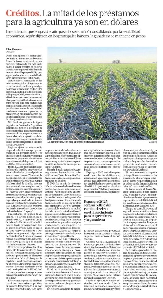 Nicolás Low, gerente de Agro- negocios de Santander Argentina, confirmó el giro en la demanda de financiamiento: «Desde el segundo semestre, diría que pesos ya no nos demandan más y, a partir de ahí, el financiamiento que más estamos dando es en dólares para el productor agropecuario».