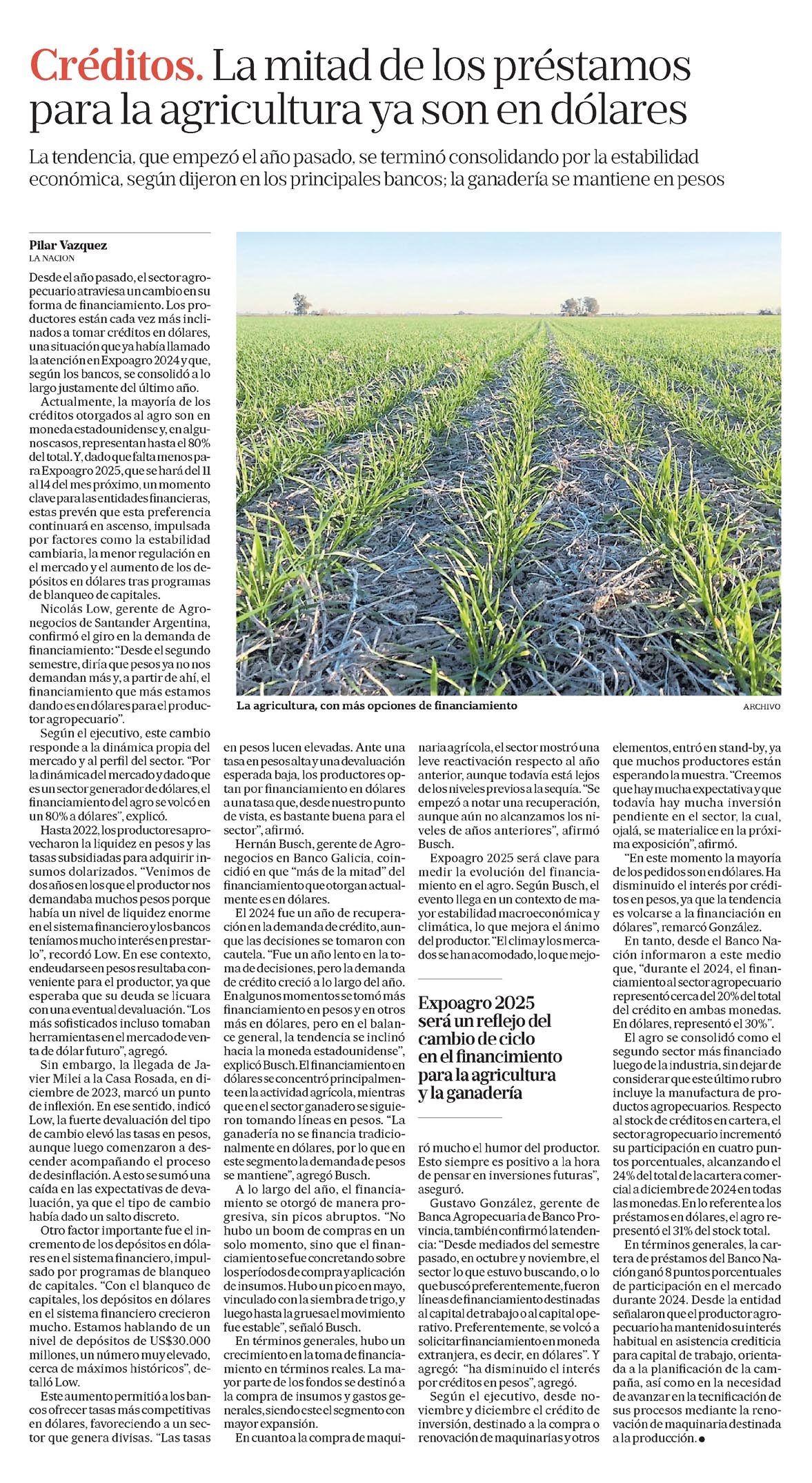 Expoagro 2025 será clave para medir la evolución del financia- miento en el agro. Según Busch, el evento llega en un contexto de mayor estabilidad macroeconómica y climática, lo que mejora el ánimo del productor. «El clima y los mercados se han acomodado, lo que mejoró mucho el humor del productor. Esto siempre es positivo a la hora de pensar en inversiones futuras», aseguró.