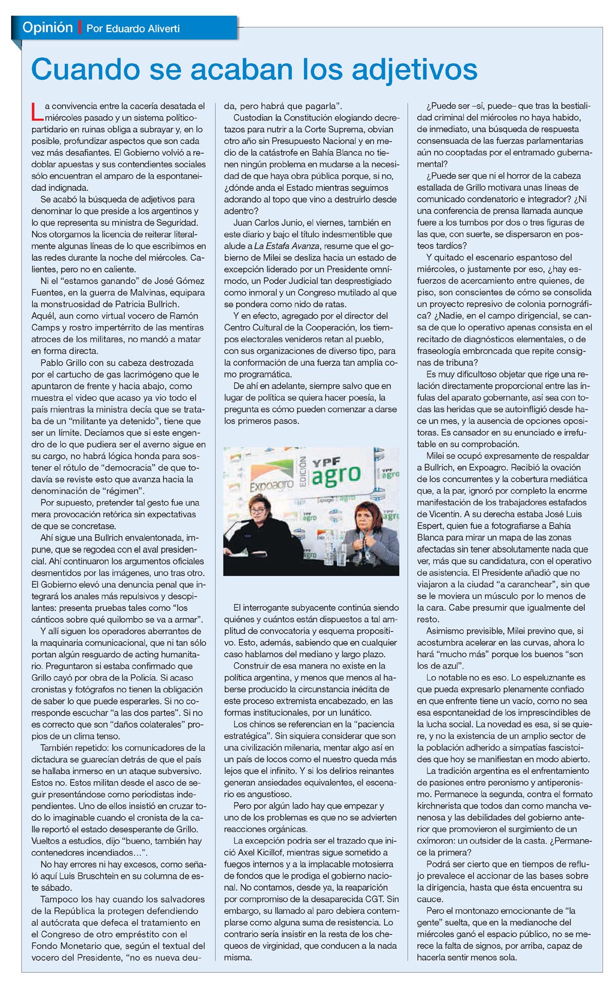 … ausencia de opciones opositoras. Es cansador en su enunciado e irrefutable en su comprobación. Milei se ocupó expresamente de respaldar a Bullrich, en Expoagro. Recibió la ovación de los concurrentes y la cobertura mediática que, a la par, ignoró por completo la enorme manifestación de los trabajadores estafados…