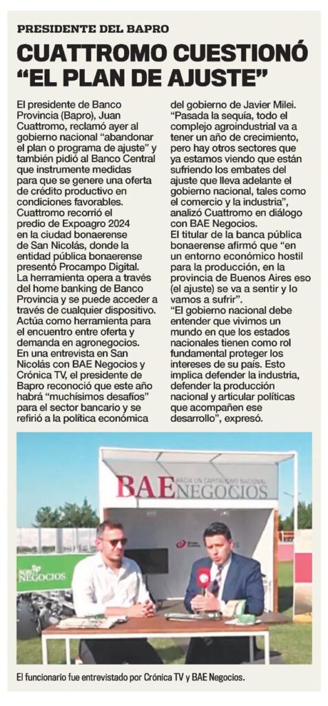 En una entrevista en San Nicolás con BAE Negocios y Crónica TV, el presidente de Bapro reconoció que este año habrá «muchísimos desafíos» para el sector bancario y se refirió a la política económica del gobierno de Javier Milei.