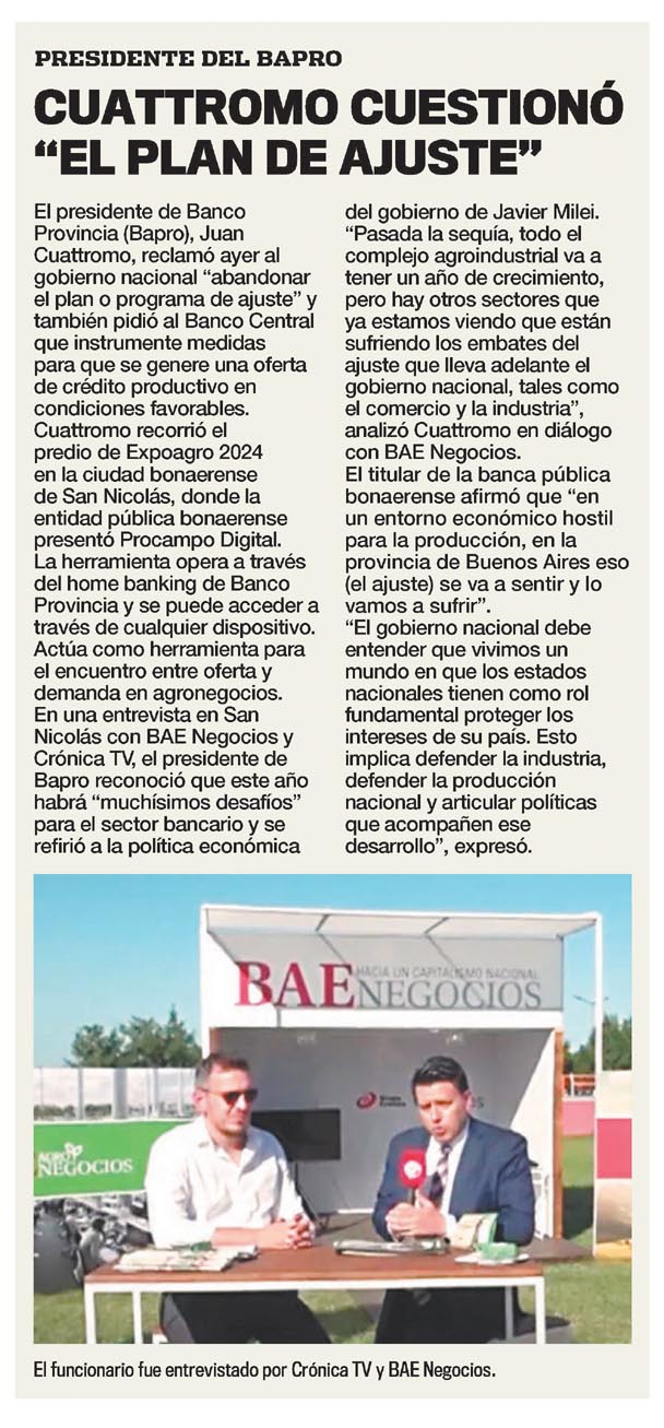 El presidente de Banco Provincia (Bapro), Juan Cuattromo, reclamó ayer al gobierno nacional «abandonar el plan o programa de ajuste» y también pidió al Banco Central que instrumente medidas para que se genere una oferta de crédito productivo en condiciones favorables.