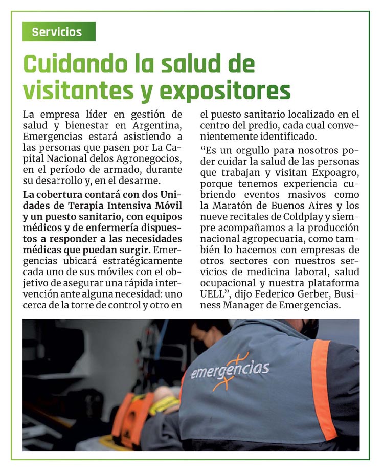 «Es un orgullo para nosotros poder cuidar la salud de las personas que trabajan y visitan Expoagro, porque tenemos experiencia cubriendo eventos masivos como la Maratón de Buenos Aires y los nueve recitales de Coldplay y siempre acompañamos a la producción nacional agropecuaria, como también lo hacemos con empresas de otros sectores con nuestros servicios de medicina laboral, salud ocupacional y nuestra plataforma UELL», dijo Federico Gerber, Business Manager de Emergencias.
