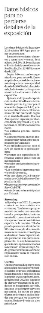 Los datos básicos de Expoagro 2023 edición YPF Agro para tener en cuenta son: La muestra comienza el martes y termina el viernes. Está abierta de 8.30 a 18. Se realiza en el Predio ferial y Autódromo de San Nicolás, Km 225 RN 9, como desde 2017.