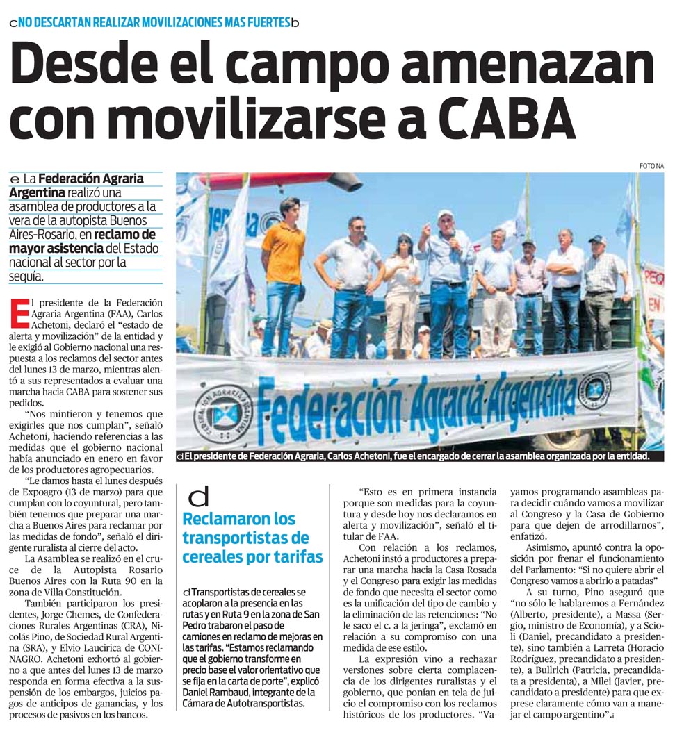El presidente de la Federación Agraria Argentina (FAA), Carlos Achetoni, declaró el «estado de alerta y movilización» de la entidad y le exigió al Gobierno nacional una respuesta a los reclamos del sector antes del lunes 13 de marzo, mientras alentó a sus representados a evaluar una marcha hacia CABA para sostener sus pedidos.