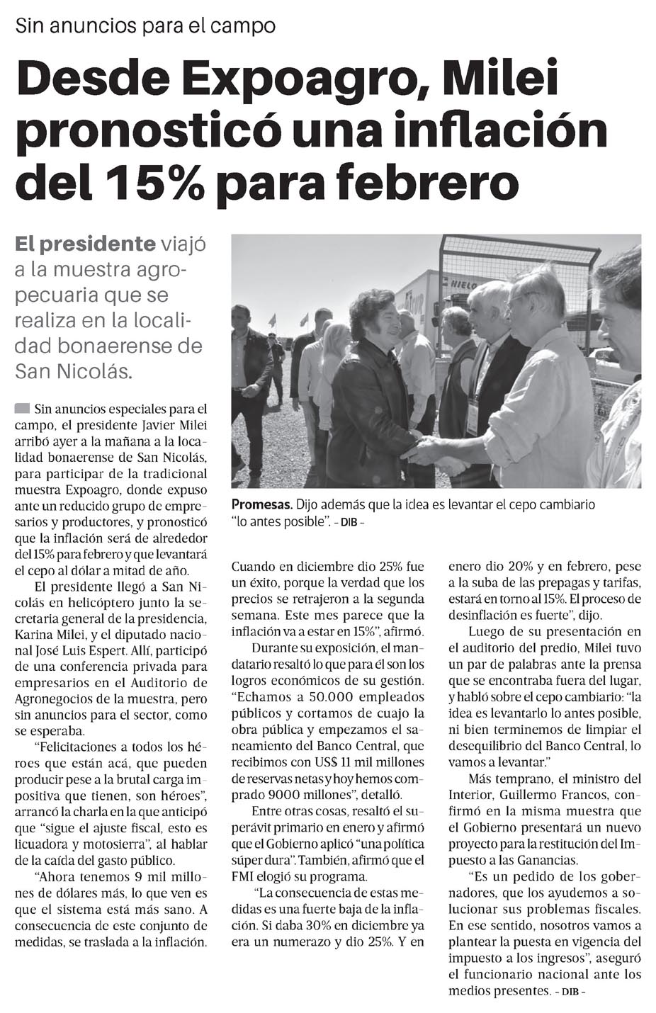 Desde Expoagro, Milei pronosticó una inflación del 15% para febreroEl presidente viajó a la muestra agropecuaria que se realiza en la localidad bonaerense de San Nicolás.EZ Sin anuncios especiales para el campo, el presidente Javier Milei arribó ayer a la mañana a la localidad bonaerense de San Nicolás, para participar de la tradicional muestra Expoagro, donde expuso ante un reducido grupo de empresarios y productores, y pronosticó que la inflación será de alrededor del 15% para febrero y que levantará el cepo al dólar a mitad de año.El presidente llegó a San Nicolás en helicóptero junto la secretaria general de la presidencia, Karina Milci, y el diputado nacional José Luis Espert. Allí, participó de una conferencia privada para empresarios en el Auditorio de Agronegocios de la muestra, pero sin anuncios para el sector, como se esperaba.“Felicitaciones a todos los héroces que están acá, que pueden producir pese a la brutal carga im positiva que tienen, son héroes”, arrancó la charla en la que anticipó que “sigue el ajuste fiscal, esto es licuadora y motosierra”, al hablar de la caída del gasto público.“Ahora tenemos 9 mil millones de dólares más, lo que ven es que el sistema está más sano. A consecuencia de este conjunto de medidas, se traslada a la inflación.“lo antes posible”. – DIB-Cuando en diciembre dio 25% fue un éxito, porque la verdad que los precios se retrajeron a la segunda semana. Este mes parece que la inflación va a estar en 15%”, afirmó.Durante su exposición, el mandatario resaltó lo que para él son los logros económicos de su gestión. “Echamos a 50.000 empleados públicos y cortamos de cuajo la obra pública y empezamos el saneamiento del Banco Central, que recibimos con US$ 11 mil millones dereservas netas y hoy hemos comprado 9000 millones”, detalló.Entre otras cosas, resaltó el superávit primario en enero y afirmó queel Gobierno aplicó “una política súper dura”. También, afirmó que el FMI elogió su programa.“La consecuencia de estas medidas es una fuerte baja de la inflación. Si daba 30% en diciembre ya era un numerazo y dio 25%. Y enPromesas. Dijo además que la idea es levantar el cepo cambiarinero dio 20% y en febrero, pese a la suba de las prepagas y tarifas, estará en torno al 15%. El proceso de desinflación es fuerte”, dijo.Luego de su presentación en el auditorio del predio, Milei tuvo un par de palabras ante la prensa que se encontraba fuera del lugar, y habló sobre el cepo cambiario: “la idea es levantarlo lo antes posible, ni bien terminemos de limpiar el desequilibrio del Banco Central, lo vamos a levantar”Más temprano, el ministro del Interior, Guillermo Francos, confirmó en la misma muestra que el Gobierno presentará un nuevo proyecto para la restitución del Impuesto a las Ganancias.“Es un pedido de los gobernadores, que los ayudemos a solucionar sus problemas fiscales. En ese sentido, nosotros vamos a plantear la puesta en vigencia del impuesto a los ingresos”, aseguró el funcionario nacional ante los medios presentes. – DIB