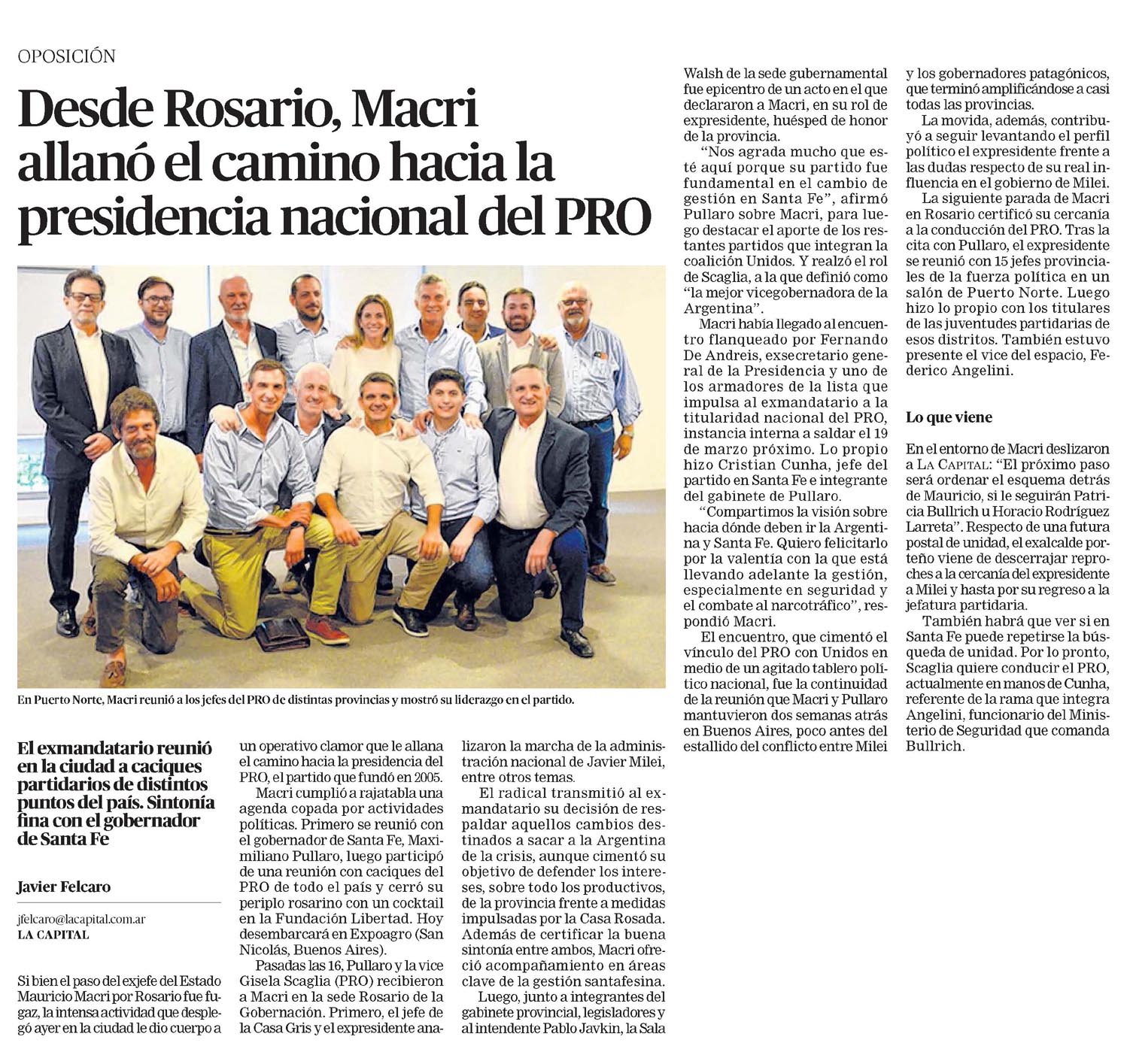 El exmandatario reunió en la ciudad a caciques partidarios de distintos puntos del país. Sintonía fina con el gobernador de Santa FeEn Puerto Norte, Macri reunió a los jefes del PRO de distintas provincias y mostró su liderazgo en el partido.Si bien el paso del exjefe del Estado Mauricio Macri por Rosario fue fugaz, la intensa actividad que desplegó ayer en la ciudad le dio cuerpo a un operativo clamor que le allana el camino hacia la presidencia del PRO, el partido que fundó en 2005.Macri cumplió a rajatabla una agenda copada por actividades políticas. Primero se reunió con el gobernador de Santa Fe, Maximiliano Pullaro, luego participó de una reunión con caciques del PRO de todo el país y cerró su periplo rosarino con un cocktail en la Fundación Libertad. Hoy desembarcará en Expoagro (San Nicolás, Buenos Aires).Pasadas las 16, Pullaro y la vice Gisela Scaglia (PRO) recibieron a Macri en la sede Rosario de la Gobernación. Primero, el jefe de la Casa Gris y el expresidente analizaron la marcha de la administración nacional de Javier Milei, entre otros temas.El radical transmitió al exmandatario su decisión de respaldar aquellos cambios destinados a sacar a la Argentina de la crisis, aunque cimentó su objetivo de defender los intereses, sobre todo los productivos, de la provincia frente a medidas impulsadas por la Casa Rosada.Además de certificar la buena sintonía entre ambos, Macri ofreció acompañamiento en áreas clave de la gestión santafesina.Luego, junto a integrantes del gabinete provincial, legisladores y al intendente Pablo Javkin, la Sala Walsh de la sede gubernamental fue epicentro de un acto en el que declararon a Macri, en su rol de expresidente, huésped de honor de la provincia.»Nos agrada mucho que esté aquí porque su partido fue fundamental en el cambio de gestión en Santa Fe», afirmó Pullaro sobre Macri, para luego destacar el aporte de los restantes partidos que integran la coalición Unidos. Y realzó el rol de Scaglia, a la que definió como «la mejor vicegobernadora de la Argentina».Macri había llegado al encuentro flanqueado por Fernando De Andreis, exsecretario general de la Presidencia y uno de los armadores de la lista que impulsa al exmandatario a la titularidad nacional del PRO, instancia interna a saldar el 19 de marzo próximo. Lo propio hizo Cristian Cunha, jefe del partido en Santa Fe e integrante del gabinete de Pullaro.»Compartimos la visión sobre hacia dónde deben ir la Argentina y Santa Fe. Quiero felicitarlo por la valentía con la que está llevando adelante la gestión, especialmente en seguridad y el combate al narcotráfico», respondió Macri.El encuentro, que cimentó el vínculo del PRO con Unidos en medio de un agitado tablero político nacional, fue la continuidad de la reunión que Macri y Pullaro mantuvieron dos semanas atrás en Buenos Aires, poco antes del estallido del conflicto entre Milei y los gobernadores patagónicos, que terminó amplificándose a casi todas las provincias.La movida, además, contribuyó a seguir levantando el perfil político el expresidente frente a las dudas respecto de su real influencia en el gobierno de Milei.La siguiente parada de Macri en Rosario certificó su cercanía a la conducción del PRO. Tras la cita con Pullaro, el expresidente se reunió con 15 jefes provinciales de la fuerza política en un salón de Puerto Norte. Luego hizo lo propio con los titulares de las juventudes partidarias de esos distritos. También estuvo presente el vice del espacio, Federico Angelini.Lo que viene En el entorno de Macri deslizaron a LA CAPITAL: «El próximo paso será ordenar el esquema detrás de Mauricio, si le seguirán Patricia Bullrich u Horacio Rodríguez Larreta». Respecto de una futura postal de unidad, el exalcalde porteño viene de descerrajar reproches a la cercanía del expresidente a Milei y hasta por su regreso a la jefatura partidaria.También habrá que ver si en Santa Fe puede repetirse la búsqueda de unidad. Por lo pronto, Scaglia quiere conducir el PRO, actualmente en manos de Cunha, referente de la rama que integra Angelini, funcionario del Ministerio de Seguridad que comanda Bullrich.