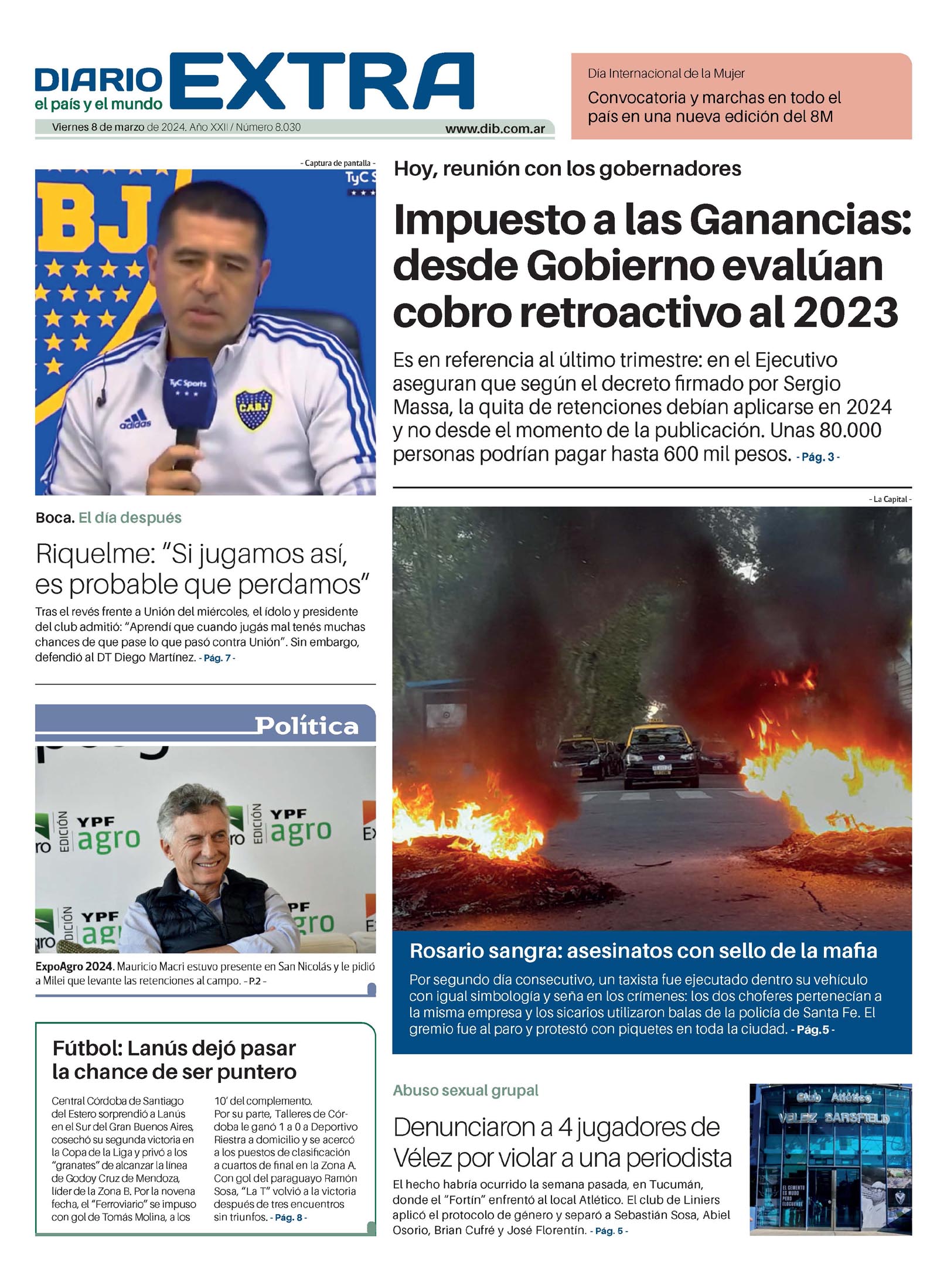 Hoy, reunión con los gobernadoresImpuesto a las Ganancias: desde Gobierno evalúan cobro retroactivo al 2023Es en referencia al último trimestre: en el Ejecutivo aseguran que según el decreto fi rmado por Sergio Massa, la quita de retenciones debían aplicarse en 2024 y no desde el momento de la publicación. Unas 80.000 personas podrían pagar hasta 600 mil pesos. – Pág. 3 -Día Internacional de la MujerConvocatoria y marchas en todo el país en una nueva edición del 8MBoca. El día despuésRiquelme: «Si jugamos así, es probable que perdamos»Tras el revés frente a Unión del miércoles, el ídolo y presidente del club admitió: «Aprendí que cuando jugás mal tenés muchas chances de que pase lo que pasó contra Unión». Sin embargo, defendió al DT Diego Martínez. – Pág. 7 -Rosario sangra: asesinatos con sello de la mafiaPor segundo día consecutivo, un taxista fue ejecutado dentro su vehículo con igual simbología y seña en los crímenes: los dos choferes pertenecían a la misma empresa y los sicarios utilizaron balas de la policía de Santa Fe. El gremio fue al paro y protestó con piquetes en toda la ciudad. – Pág.5PolíticaExpoAgro 2024. Mauricio Macri estuvo presente en San Nicolás y le pidió a Milei que levante las retenciones al campo. – P.2 -Fútbol: Lanús dejó pasar la chance de ser puntero Central Córdoba de Santiago del Estero sorprendió a Lanús en el Sur del Gran Buenos Aires, cosechó su segunda victoria en la Copa de la Liga y privó a los «granates» de alcanzar la línea de Godoy Cruz de Mendoza, líder de la Zona B. Por la novena fecha, el «Ferroviario» se impuso con gol de Tomás Molina, a los 10? del complemento.Por su parte, Talleres de Córdoba le ganó 1 a 0 a Deportivo Riestra a domicilio y se acercó a los puestos de clasifi cación a cuartos de fi nal en la Zona A.Con gol del paraguayo Ramón Sosa, «La T» volvió a la victoria después de tres encuentros sin triunfos. – Pág. 8 -Abuso sexual grupalDenunciaron a 4 jugadores de Vélez por violar a una periodistaEl hecho habría ocurrido la semana pasada, en Tucumán, donde el «Fortín» enfrentó al local Atlético. El club de Liniers aplicó el protocolo de género y separó a Sebastián Sosa, Abiel Osorio, Brian Cufré y José Florentín. – Pág. 5 –