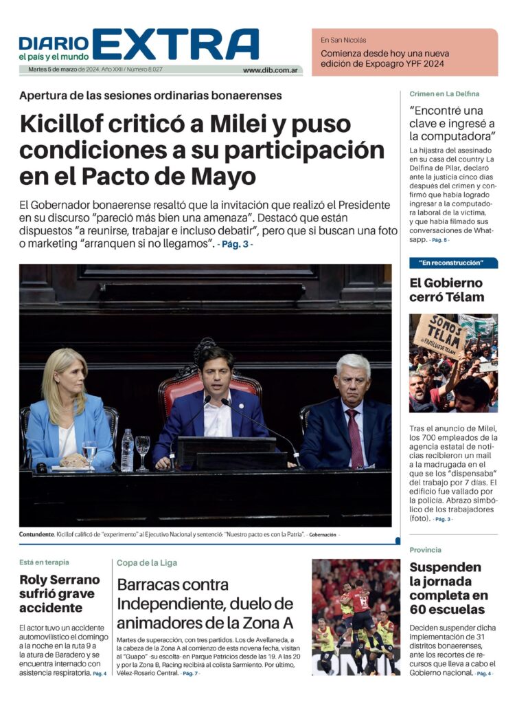 En San Nicolás Comienza desde hoy una nueva edición de Expoagro YPF 2024Apertura de las sesiones ordinarias bonaerenses Kicillof criticó a Milei y puso condiciones a su participación en el Pacto de Mayo El Gobernador bonaerense resaltó que la invitación que realizó el Presidente en su discurso «pareció más bien una amenaza». Destacó que están dispuestos «a reunirse, trabajar e incluso debatir», pero que si buscan una foto o marketing «arranquen si no llegamos». – Pág. 3 ?Contundente. Kicillof calificó de «experimento» al Ejecutivo Nacional y sentenció: «Nuestro pacto es con la Patria». – Gobernación ?Roly Serrano sufrió grave accidente El actor tuvo un accidente automovilístico el domingo a la noche en la ruta 9 a la atura de Baradero y se encuentra internado con asistencia respiratoria. Pág. 4 Está en terapiaCopa de la Liga Barracas contra Independiente, duelo de animadores de la Zona A Martes de superacción, con tres partidos. Los de Avellaneda, a la cabeza de la Zona A al comienzo de esta novena fecha, visitan al «Guapo» -su escolta- en Parque Patricios desde las 19. A las 20 y por la Zona B, Racing recibirá al colista Sarmiento. Por último, Vélez-Rosario Central. – Pág. 7 ?Suspenden la jornada completa en 60 escuelas Deciden suspender dicha implementación de 31 distritos bonaerenses, ante los recortes de recursos que lleva a cabo el Gobierno nacional. – Pág. 4 – ProvinciaCrimen en La Delfi na «Encontré una clave e ingresé a la computadora» La hijastra del asesinado en su casa del country La Delfina de Pilar, declaró ante la justicia cinco días después del crimen y confirmó que había logrado ingresar a la computadora laboral de la víctima, y que había filmado sus conversaciones de Whatsapp.- Pág. 5 ?El Gobierno cerró Télam «En reconstrucción» Tras el anuncio de Milei, los 700 empleados de la agencia estatal de noticias recibieron un mail a la madrugada en el que se los «dispensaba» del trabajo por 7 días. El edificio fue vallado por la policía. Abrazo simbólico de los trabajadores (foto). – Pág. 3 –