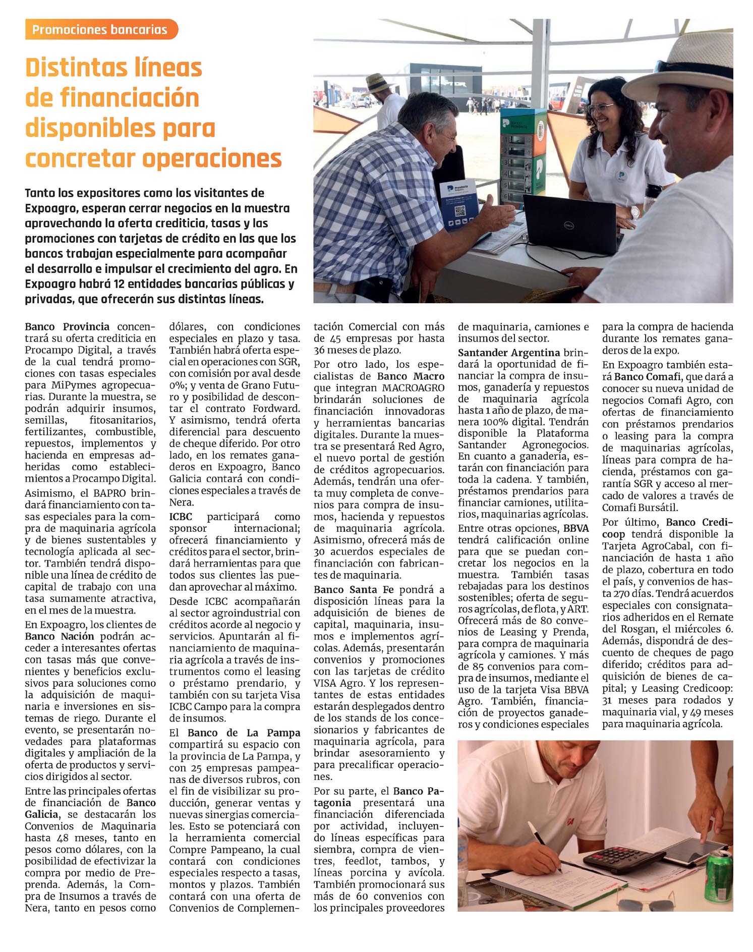 En Expoagro, los clientes de Banco Nación podrán acceder a interesantes ofertas con tasas más que convenientes y beneficios exclusivos para soluciones como la adquisición de maquinaria e inversiones en sistemas de riego. Durante el evento, se presentarán novedades para plataformas digitales y ampliación de la oferta de productos y servicios dirigidos al sector. Entre las principales ofertas de financiación de Banco Galicia, se destacarán los Convenios de Maquinaria hasta 48 meses, tanto en pesos como dólares, con la posibilidad de efectivizar la compra por medio de Preprenda. Además, la Compra de Insumos a través de Ñera, tanto en pesos como dólares, con condiciones especiales en plazo y tasa. También habrá oferta especial en operaciones con SGR, con comisión por aval desde 0%; y venta de Grano Futuro y posibilidad de descontar el contrato Fordward. Y asimismo, tendrá oferta diferencial para descuento de cheque diferido. Por otro lado, en los remates ganaderos en Expoagro, Banco Galicia contará con condiciones especiales a través de Ñera.