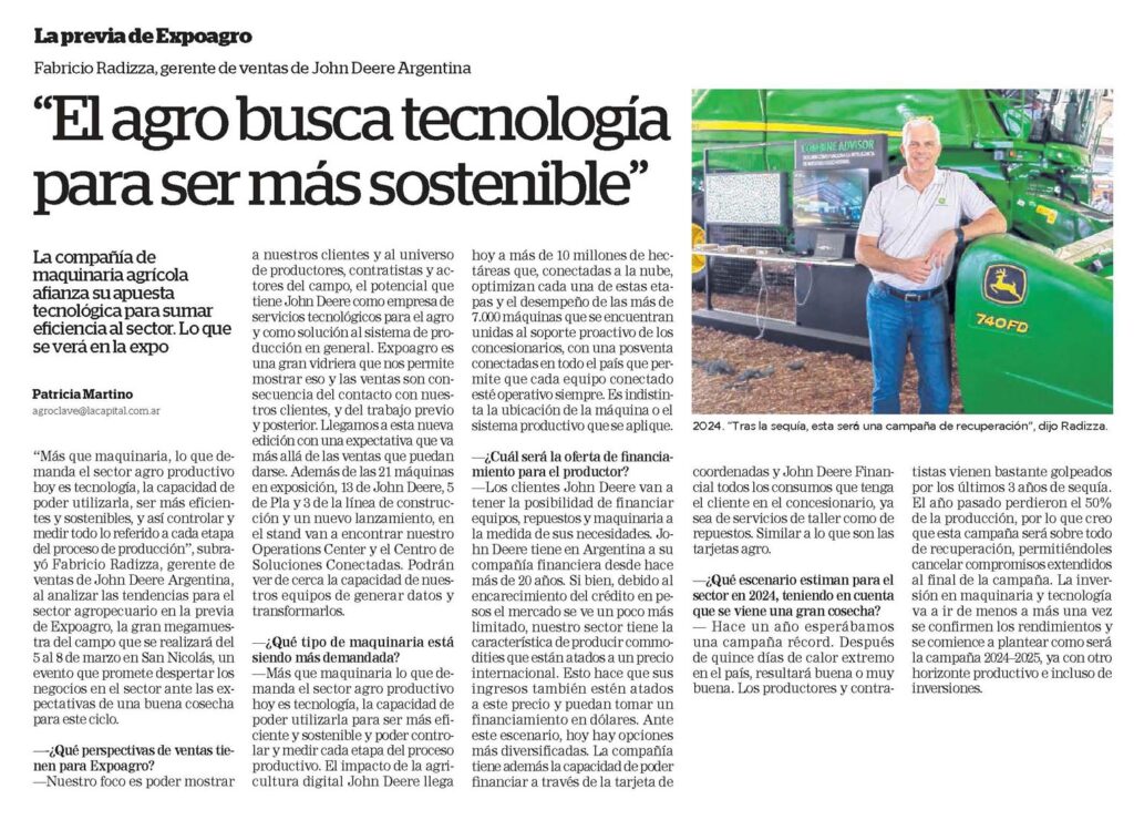 La compañía de maquinaria agrícola afianza su apuesta tecnológica para sumar eficiencia al sector. Lo que se verá en la expoMás que maquinaria, lo que demanda el sector agro productivo hoy es tecnología, la capacidad de poder utilizarla, ser más eficientes y sostenibles, y así controlar y medir todo lo referido a cada etapa del proceso de producción», subrayó Fabricio Radizza, gerente de ventas de John Deere Argentina, al analizar las tendencias para el sector agropecuario en la previa de Expoagro, la gran megamuestra del campo que se realizará del 5 al 8 de marzo en San Nicolás, un evento que promete despertar los negocios en el sector ante las expectativas de una buena cosecha para este ciclo.–¿Qué perspectivas de ventas tienen para Expoagro? -Nuestro foco es poder mostrar a nuestros clientes y al universo de productores, contratistas y actores del campo, el potencial que tiene John Deere como empresa de servicios tecnológicos para el agro y como solución al sistema de producción en general. Expoagro es una gran vidriera que nos permite mostrar eso y las ventas son consecuencia del contacto con nuestros clientes, y del trabajo previo y posterior. Llegamos a esta nueva edición con una expectativa que va más allá de las ventas que puedan darse. Además de las 21 máquinas en exposición, 13 de John Deere, 5 de Pla y 3 de la línea de construcción y un nuevo lanzamiento, en el stand van a encontrar nuestro Operations Center y el Centro de Soluciones Conectadas. Podrán ver de cerca la capacidad de nuestros equipos de generar datos y transformarlos.-¿Qué tipo de maquinaria está siendo más demandada? -Más que maquinaria lo que demanda el sector agro productivo hoy es tecnología, la capacidad de poder utilizarla para ser más eficiente y sostenible y poder controlar y medir cada etapa del proceso productivo. El impacto de la agricultura digital John Deere llega hoy a más de 10 millones de hectáreas que, conectadas a la nube, optimizan cada una de estas etapas y el desempeño de las más de 7.000 máquinas que se encuentran unidas al soporte proactivo de los concesionarios, con una posventa conectadas en todo el país que permite que cada equipo conectado esté operativo siempre. Es indistinta la ubicación de la máquina o el sistema productivo que se aplique.-¿Cuál será la oferta de financiamiento para el productor? -Los clientes John Deere van a tener la posibilidad de financiar equipos, repuestos y maquinaria a la medida de sus necesidades. John Deere tiene en Argentina a su compañía financiera desde hace más de 20 años. Si bien, debido al encarecimiento del crédito en pesos el mercado se ve un poco más limitado, nuestro sector tiene la característica de producir commodities que están atados a un precio internacional. Esto hace que sus ingresos también estén atados a este precio y puedan tomar un financiamiento en dólares. Ante este escenario, hoy hay opciones más diversificadas. La compañía tiene además la capacidad de poder financiar a través de la tarjeta de coordenadas y John Deere Financial todos los consumos que tenga el cliente en el concesionario, ya sea de servicios de taller como de repuestos. Similar a lo que son las tarjetas agro.-¿Qué escenario estiman para el sector en 2024, teniendo en cuenta que se viene una gran cosecha? – Hace un año esperábamos una campaña récord. Después de quince días de calor extremo en el país, resultará buena o muy buena. Los productores y contra- tistas vienen bastante golpeados por los últimos 3 años de sequía.El año pasado perdieron el 50% de la producción, por lo que creo que esta campaña será sobre todo de recuperación, permitiéndoles cancelar compromisos extendidos al final de la campaña. La inversión en maquinaria y tecnología va a ir de menos a más una vez se confirmen los rendimientos y se comience a plantear como será la campaña 2024?2025, ya con otro horizonte productivo e incluso de inversiones.2024. «Tras la sequía, esta será una campaña de recuperación», dijo Radizza