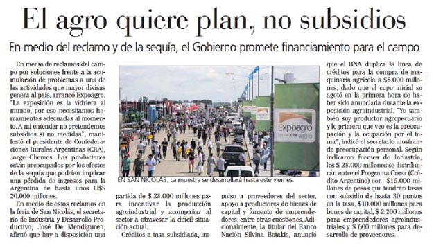 En medio de reclamos del campo por soluciones frente a la acu- muladón de problemas a una de las actividades que mayor divisas genera al país, arrancó Expoagro. «La exposición es la vidriera al mundo, por eso necesitamos herramientas adecuadas al momento. A mi entender no pretendemos subsidios si no medidas», manifestó el presidente de Confederaciones Rurales Argentinas (CRA), Jorge Chemes. Los productores están preocupados por los efectos de la sequía que podrían implicar una pérdida de ingresos para la Argentina de hasta unos U$S 20.000 millones.
