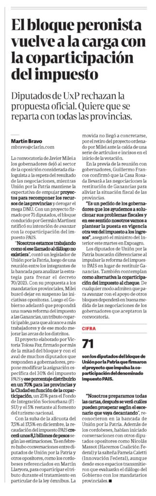 Diputados de UxP rechazan la propuesta oficial. Quiere que se reparta con todas las provincias.mbravo@clarín.comLa convocatoria de Javier Milei a los gobernadores dejó al sector de la oposición considerada dialoguista a la espera del resultado de las negociaciones, mientras Unión por la Patria mantiene la expectativa de empujar proyectos para recomponer los recursos de las provincias y derogar el mega DNU. Con un proyecto firmado por 71 diputados, el bloque conducido por Germán Martínez ratificó su intención de avanzar con la coparticipación del impuesto PAIS.»Nosotros estamos trabajando como si ese llamado al diálogo no existiera», contó un legislador de Unión por la Patria, luego de una reunión entre los integrantes de la bancada para analizar la estrategia para frenar el decreto 70/2023. Con su propuesta a los mandatarios provinciales, Milei buscó dejar en suspenso las iniciativas opositoras. Luego el Gobierno adelantó que propondrá una nueva reforma del impuesto a las Ganancias, un tributo coparticipable, para que alcance a más trabajadores y de ese modo mejorar las arcas de los distritos.El proyecto elaborado por Victoria Tolosa Paz, firmado por más de la mitad del bloque y con el aval de muchos diputados que responden a gobernadores, propone modificar la asignación específica del 30% del impuesto PAIS y ese porcentaje distribuirlo en un 70% para las provincias y la Ciudad en función de la coparticipación, un 25% para el Fondo de Integración Sociourbana (FISU) y el 5% restante al fomento del turismo nacional.Con la suba de la alícuota del 7,5% al 17,5% en diciembre, la recaudación del impuesto PAIS crecerá unos 8,1 billones de pesos según las estimaciones. Ya en febrero hubo conversaciones entre diputados de Unión por la Patria y otros opositores, como los cordobeses referenciados en Martín Llaryora, para coparticipar el tributo durante el tratamiento en particular de la ley ómnibus. La movida no llegó a concretarse, por el retiro del proyecto ordenado por Milei ante la caída de una serie de artículos e incisos en el inicio de la votación.En la previa de la reunión con gobernadores, Guillermo Francos confirmó que la Casa Rosada llevará a las negociaciones la restitución de Ganancias para aliviar la situación fiscal de las provincias.»Es un pedido de los gobernadores que los ayudemos a solucionar sus problemas fiscales y en ese sentido nosotros vamos a plantear la puesta en vigencia otra vez del impuesto a los ingresos», aseguró el ministro del Interior este martes en Expoagro.Los diputados de Unión por la Patria buscarán diferenciarse al impulsar la reforma del impuesto PAIS en lugar de restituir Ganancias.También contemplan como alternativa la coparticipación del impuesto al cheque. De cualquier modo admiten que para avanzar con el apoyo de otros bloques dependerá en buena medida de las negociaciones de los gobernadores que aceptaron la convocatoria.»Nosotros preparamos todas las cartas, después se verá cuáles pueden prosperar según el escenario que vaya decantando», reconocieron en la bancada de Unión por la Patria. Además de los cordobeses, habían iniciado conversaciones con otros diputados opositores como Nicolás Massot (Hacemos Coalición Federal) y la salteña Pamela Caletti (Innovación Federal), aunque desde esos espacios transmitieron que evaluarán el diálogo del Gobierno con los mandatarios provinciales.CIFRA71 son los diputados del bloque de Unión por la Patria que firmaron el proyecto que impulsa la coparticipación del denominado Impuesto PAIS.
