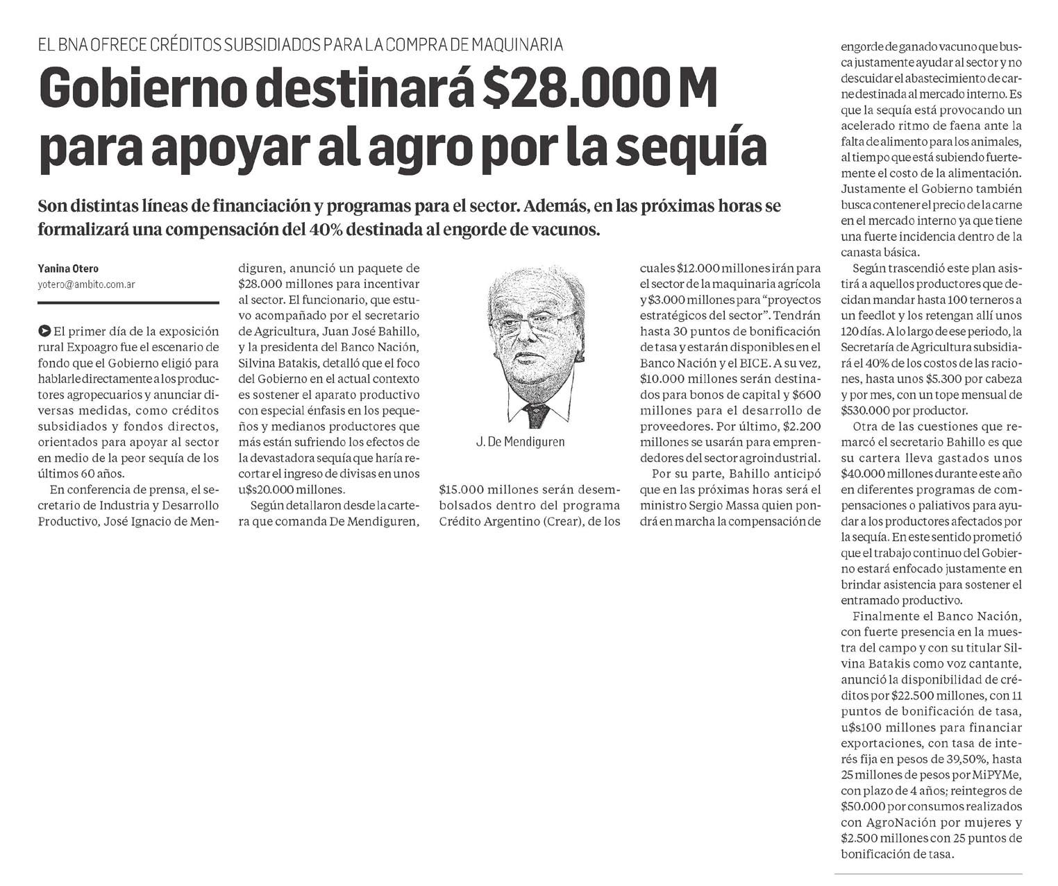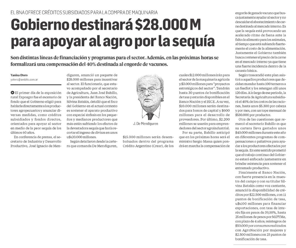El primer día de la exposición rural Expoagro fue el escenario de fondo que el Gobierno eligió para hablarle directamente a los productores agropecuarios y anunciar diversas medidas, como créditos subsidiados y fondos directos, orientados para apoyar al sector en medio de la peor sequía de los últimos 60 años. En conferencia de prensa, el secretario de Industria y Desarrollo Productivo, José Ignacio de Mendiguren, anunció un paquete de $28.000 millones para incentivar al sector. El funcionario, que estuvo acompañado por el secretario de Agricultura, Juan José Bahillo, y la presidenta del Banco Nación, Silvina Batakis, detalló que el foco del Gobierno en el actual contexto es sostener el aparato productivo con especial énfasis en los pequeños y medianos productores que más están sufriendo los efectos de la devastadora sequía que haría recortar el ingreso de divisas en unos u$s20.000 millones. Según detallaron desde la cartera que comanda De Mendiguren, $15.000 millones serán desembolsados dentro del programa Crédito Argentino (Crear), de los cuales $12.000 millones irán para el sector de la maquinaria agrícola y $3.000 millones para «proyectos estratégicos del sector». Tendrán hasta 30 puntos de bonificación de tasa y estarán disponibles en el Banco Nación y el BICE. A su vez, $10.000 millones serán destinados para bonos de capital y $600 millones para el desarrollo de proveedores. Por último, $2.200 millones se usarán para emprendedores del sector agroindustrial. Por su parte, Bahillo anticipó que en las próximas horas será el ministro Sergio Massa quien pondrá en marcha la compensación de engorde de ganado vacuno que busca justamente ayudar al sector y no descuidar el abastecimiento de carne destinada al mercado interno. Es que la sequía está provocando un acelerado ritmo de faena ante la falta de alimento para los animales, al tiempo que está subiendo fuertemente el costo de la alimentación. Justamente el Gobierno también busca contener el precio de la carne en el mercado interno ya que tiene una fuerte incidencia dentro de la canasta básica. Según trascendió este plan asistirá a aquellos productores que decidan mandar hasta 100 terneros a un feedlot y los retengan allí unos 120 días. A lo largo de ese periodo, la Secretaría de Agricultura subsidiará el 40% de los costos de las raciones, hasta unos $5.300 por cabeza y por mes, con un tope mensual de $530.000 por productor. Otra de las cuestiones que remarcó el secretario Bahillo es que su cartera lleva gastados unos $40.000 millones durante este año en diferentes programas de compensaciones o paliativos para ayudar a los productores afectados por la sequía. En este sentido prometió que el trabajo continuo del Gobierno estará enfocado justamente en brindar asistencia para sostener el entramado productivo. Finalmente el Banco Nación, con fuerte presencia en la muestra del campo y con su titular Silvina Batakis como voz cantante, anunció la disponibilidad de créditos por $22.500 millones, con 11 puntos de bonificación de tasa, u$s100 millones para financiar exportaciones, con tasa de interés fija en pesos de 39,50%, hasta 25 millones de pesos por MiPYMe, con plazo de 4 años; reintegros de $50.000 por consumos realizados con AgroNación por mujeres y $2.500 millones con 25 puntos de bonificación de tasa.