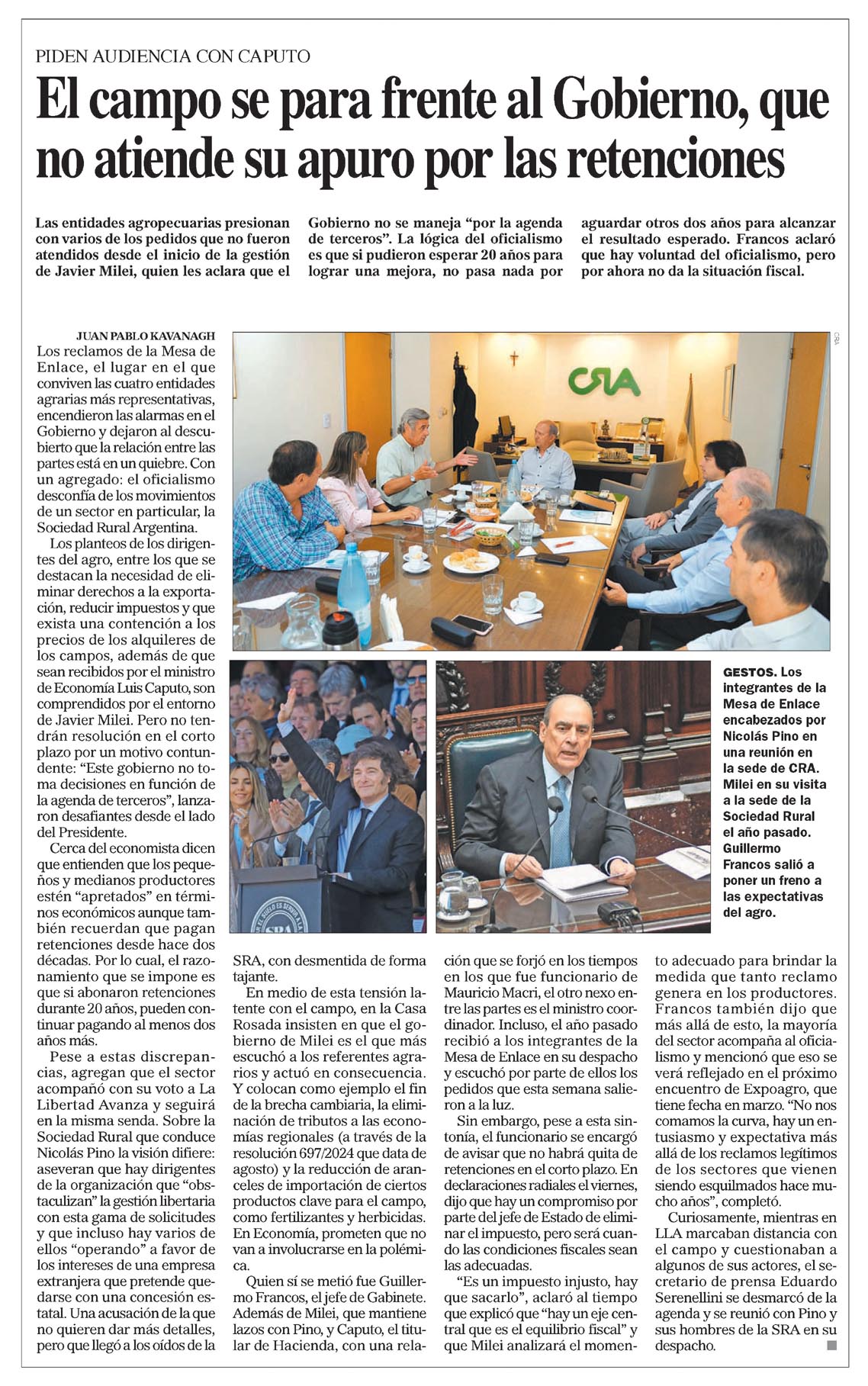 juan pablo kavanagh Los reclamos de la Mesa de Enlace, el lugar en el que conviven las cuatro entidades agrarias más representativas, encendieron las alarmas en el Gobierno y dejaron al descubierto que la relación entre las partes está en un quiebre. Con un agregado: el oficialismo desconfía de los movimientos de un sector en particular, la Sociedad Rural Argentina.