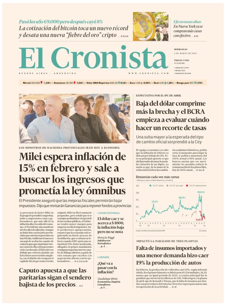 Pasó los u$s 69.000 pero después cayó 8% La cotización del bitcoin toca un nuevo récord y desata una nueva «fiebre del oro» cripto p. 17 y 21Pasó los u$s 69.000 pero después cayó 8% La cotización del bitcoin toca un nuevo récord y desata una nueva «fiebre del oro» cripto p. 17 y 21Efecto tasas altas En Nueva York ya se compran más casas con efectivo p. 23EXPECTATI VA POR EL IPC DE ABRIL Baja del dólar comprime más la brecha y el BCRA empieza a evaluar cuándo hacer un recorte de tasas Una suba mayor a la esperada del tipo de cambio oficial sorprendió a la City el equipo económico ya sabe que la inflación de febrero se ubicará por debajo de 15%. Pero su principal apuesta es que abril permita alcanzar la ansiada variación de un dígito. La razón es que, de la mano de la reducción de la brecha cambiaria a mínimos históricos, podría sería el momento para bajar la tasa de política monetaria del 100% actual a 90% anual. Los bancos ansían que ese movimiento les permita reducir la remuneración de los plazos fijos, hoy de 110% anual. p. 14 y 15IMPACT ó LA PARÁLISIS DE TRES PLANTAS Falta de insumos importados y una menor demanda hizo caer 19% la producción de autos En febrero, la producción de vehículos cayó 19%, según informó Adefa. En el primer bimestre se fabricaron 60.134 unidades, 18,2% menos que en igual período de 2023. La razón principal fue la parálisis que tuvieron las fábricas de GM, Volkswagen y la planta de pick-ups de Renault y Nissan, por la falta de insumos por deudas con proveedores del exterior. El sector espera para marzo una recuperación de la actividad. p. 19LOS MINISTROS DE HACIEN DA PRO VINCIALES IRÁN HOY A ECONOMIA Milei espera inflación de 15% en febrero y sale a buscar los ingresos que prometía la ley ómnibus El Presidente aseguró que las mejoras fiscales permitirán bajar impuestos. Dijo que revisarán Ganancias para reponer fondos a provincias La presencia de Javier Milei en Expoagro le permitió comprobar, tanto a empresarios como a gobernadores, que más allá de la inflación alta y la caída del consumo, el Presidente aún mantiene niveles altos de adhesión. Aunque no hubo foto con los jefes provinciales que estuvieron presentes en San Nicolás, Guillermo Francos se encargó de aceitar los canales de contacto para que el próximo viernes varios de ellos estén presentes en la Casa Rosada. El Ejecutivo ya definió que volverá a insistir con la ley Bases en su versión completa, con el objetivo de recuperar el capítulo fiscal que tenía el texto original. Milei no llevó anuncios preparados, pero señaló que si se consigue profundizar el superávit de las cuentas públicas, el Gobierno tendrá mayor margen para empezar a reducir impuestos. Ante productores agropecuarios, remarcó que la economía está registrando un fuerte proceso de desinflación, que se notará en febrero cuando el IPC anote una variación de 15%. En la Casa Rosada, allegados al primer mandatario consignaron que hay nuevos canales de diálogo abiertos a partir de esta semana que exceden a la negociación abierta con los gobernadores.p. 6, 7, 8, 9 y 10Caputo apuesta a que las paritarias sigan el sendero bajista de los precios P. 4zoom editorialEl dólar cae y se acerca a $ 1000, la inflación baja pero no se nota Horacio Riggi Subdirector Periodístico p. 2opinión¿Qué va a pasar con la inflación? Guadalupe Birón Economista. Empiria Consultores p. 3