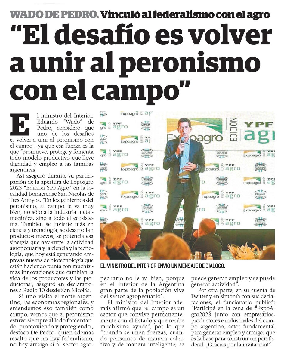 El ministro del Interior, Eduardo «Wado» de Pedro, consideró que uno de los desafíos es volver a unir al peronismo con el campo , ya que esa fuerza es la que «promueve, protege y fomenta todo modelo productivo que lleve dignidad y empleo a las familias argentinas .