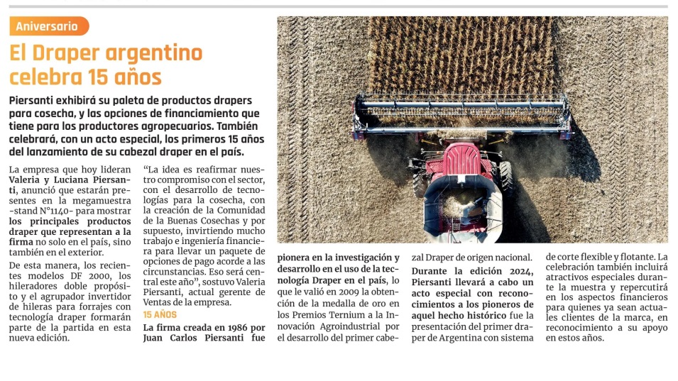 Piersanti exhibirá su paleta de productos drapers para cosecha, y las opciones de financiamiento que tiene para los productores agropecuarios. También celebrará, con un acto especial, los primeros 15 años del lanzamiento de su cabezal draper en el país.