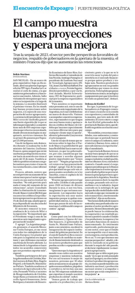 También participaron del acto los gobernadores de Córdoba, Martín Llaryora; de Entre Ríos, Rogelio Frigerio, y de Santa Fe, Maximiliano Pullaro. También acudieron el secretario de Agricultura de la Nación, Fernando vilella; el ministro de Bioagroindustria de Córdoba, Sergio Busso, y el ministro de Desarrollo Agrario bonaerense, Javier Rodríguez; el ministro de Desarrollo Económico de Entre Ríos, Guillermo Bernaudo; el intendente de San Nicolás, Santiago Passaglia; el presidente del Instituto Nacional de Tecnología Agropecuaria (IN- TA), Juan Cruz Molina Hafford. Por el diario la nación, Fernán Saguier, director periodístico, y por Clarín, José Aranda. Martín Schwartz- man, CEO de Exponenciar, participó por la empresa organizadora de la muestra.