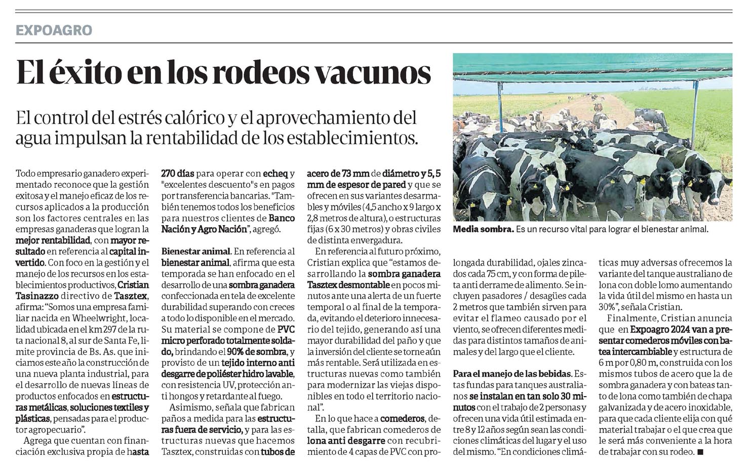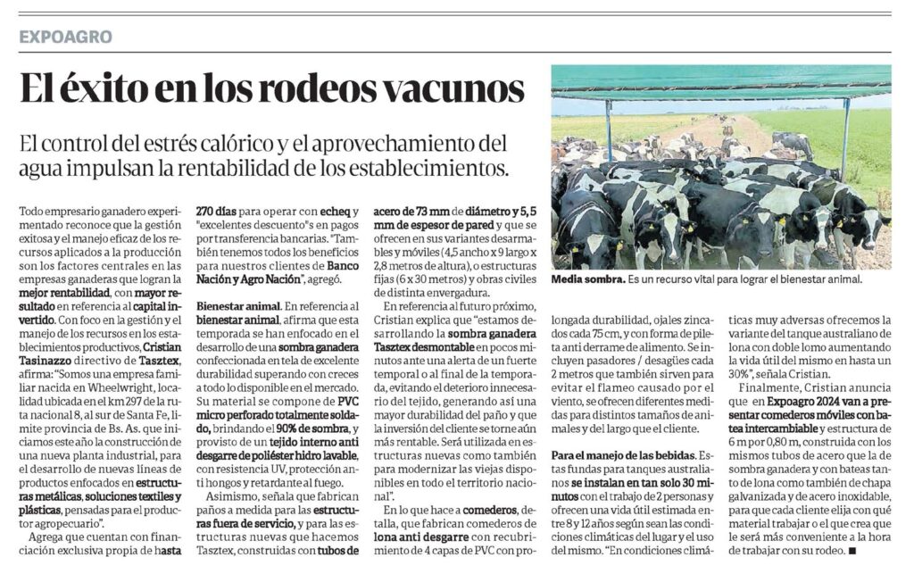 El control del estrés calórico y el aprovechamiento del agua impulsan la rentabilidad de los establecimientos.Media sombra. Es un recurso vital para lograr el bienestar animal.Todo empresario ganadero experimentado reconoce que la gestión exitosa y el manejo eficaz de los recursos aplicados a la producción son los factores centrales en las empresas ganaderas que logran la mejor rentabilidad, con mayor resultado en referencia al capital invertido.Con foco en la gestión y el manejo de los recursos en los establecimientos productivos, Cristian Tasinazzo directivo de Tasztex, afirma: «Somos una empresa familiar nacida en Wheelwright, localidad ubicada en el km 297 de la ruta nacional 8, al sur de Santa Fe, limite provincia de Bs. As. que iniciamos este año la construcción de una nueva planta industrial, para el desarrollo de nuevas líneas de productos enfocados en estructuras metálicas, soluciones textiles y plásticas, pensadas para el productor agropecuario».Agrega que cuentan con financiación exclusiva propia de hasta 270 días para operar con echeq y «excelentes descuento»s en pagos por transferencia bancarias. «También tenemos todos los beneficios para nuestros clientes de Banco Nación y Agro Nación», agregó.Bienestar animal. En referencia al bienestar animal, afirma que esta temporada se han enfocado en el desarrollo de una sombra ganadera confeccionada en tela de excelente durabilidad superando con creces a todo lo disponible en el mercado.Su material se compone de PVC micro perforado totalmente soldado, brindando el 90% de sombra, y provisto de un tejido interno anti desgarre de poliéster hidro lavable, con resistencia UV, protección anti hongos y retardante al fuego.Asimismo, señala que fabrican paños a medida para las estructuras fuera de servicio, y para las estructuras nuevas que hacemos Tasztex, construidas con tubos de acero de 73 mm de diámetro y 5, 5 mm de espesor de pared y que se ofrecen en sus variantes desarmables y móviles (4,5 ancho x 9 largo x 2,8 metros de altura), o estructuras fijas (6 x 30 metros) y obras civiles de distinta envergadura.En referencia al futuro próximo, Cristian explica que «estamos desarrollando la sombra ganadera Tasztex desmontable en pocos minutos ante una alerta de un fuerte temporal o al final de la temporada, evitando el deterioro innecesario del tejido, generando así una mayor durabilidad del paño y que la inversión del cliente se torne aún más rentable. Será utilizada en estructuras nuevas como también para modernizar las viejas disponibles en todo el territorio nacional».En lo que hace a comederos, detalla, que fabrican comederos de lona anti desgarre con recubrimiento de 4 capas de PVC con prolongada durabilidad, ojales zincados cada 75 cm, y con forma de pileta anti derrame de alimento. Se incluyen pasadores / desagües cada 2 metros que también sirven para evitar el flameo causado por el viento, se ofrecen diferentes medidas para distintos tamaños de animales y del largo que el cliente.Para el manejo de las bebidas. Estas fundas para tanques australianos se instalan en tan solo 30 minutos con el trabajo de 2 personas y ofrecen una vida útil estimada entre 8 y 12 años según sean las condiciones climáticas del lugar y el uso del mismo. «En condiciones climáticas muy adversas ofrecemos la variante del tanque australiano de lona con doble lomo aumentando la vida útil del mismo en hasta un 30%», señala Cristian.Finalmente, Cristian anuncia que en Expoagro 2024 van a presentar comederos móviles con batea intercambiable y estructura de 6 m por 0,80 m, construida con los mismos tubos de acero que la de sombra ganadera y con bateas tanto de lona como también de chapa galvanizada y de acero inoxidable, para que cada cliente elija con qué material trabajar o el que crea que le será más conveniente a la hora de trabajar con su rodeo.