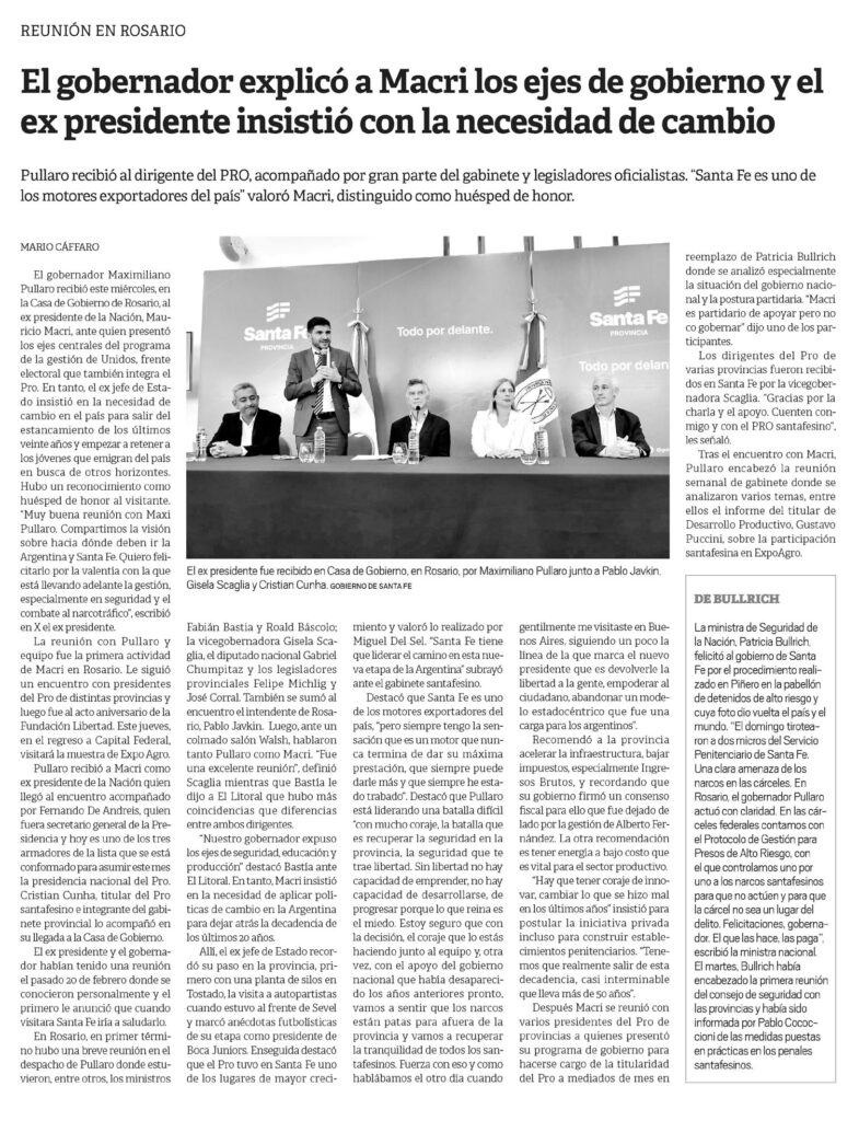 REUNIÓN EN ROSARIOEl gobernador explicó a Macri los ejes de gobierno y el ex presidente insistió con la necesidad de cambioPullaro recibió al dirigente del PRO, acompañado por gran parte del gabinete y legisladores oficialistas. “Santa Fe es uno de los motores exportadores del país” valoró Macri, distinguido como huésped de honor.MARIO CÁFFAROEl gobernador Maximiliano Pullaro recibió este miércoles, en la Casa de Gobierno de Rosario, al ex presidente de la Nación, Mauricio Macri, ante quien presentó los ejes centrales del programa de la gestión de Unidos, frente electoral que también integra el Pro. En tanto, el ex jefe de Estado insistió en la necesidad de cambio en el país para salir del estancamiento de los últimos veinte años y empezar a retener a losjóvenes que emigran del país en busca de otros horizontes. Hubo un reconocimiento como huésped de honor al visitante. “Muy buena reunión con Maxi Pullaro. Compartimos la visión sobre hacia dónde deben ir la Argentina y Santa Fe. Quiero felicitarlo por la valentía con la que está llevando adelante la gestión, especialmente en seguridad y el combate al narcotráfico”, escribió en X el ex presidente.La reunión con Pullaro y equipo fue la primera actividad de Macri en Rosario. Le siguió un encuentro con presidentes del Pro de distintas provincias y luego fue al acto aniversario de la Fundación Libertad. Este jueves, en el regreso a Capital Federal, visitará la muestra de Expo Agro.Pullaro recibió a Macri como ex presidente de la Nación quien llegó al encuentro acompañado por Fernando De Andreis, quien fuera secretario general de la Presidencia y hoy es uno de los tres armadores de la lista que se está conformado para asumir este mes la presidencia nacional del Pro. Cristian Cunha, titular del Pro santafesino e integrante del gabinete provincial lo acompañó en su llegada a la Casa de Gobierno.El ex presidente y el gobernador habían tenido una reunión el pasado 20 de febrero donde se conocieron personalmente y el primero le anunció que cuando visitara Santa Feiría a saludarlo.En Rosario, en primer término hubo una breve reunión en el despacho de Pullaro donde estuvieron, entre otros, los ministrosEl ex presidente fue recibido en Casa de Gobierno, en Rosario, por Maximiliano Pullaro junto a Pablo Javkin, Gisela Scaglia y Cristian Cunha. coslerno DE SANTAFEFabián Bastia y Roald Báscolo; la vicegobernadora Gisela Scaglia, el diputado nacional Gabriel Chumpitaz y los legisladores provinciales Felipe Michlig y José Corral. También se sumó al encuentro el intendente de Rosario, Pablo Javkin. Luego, ante un colmado salón Walsh, hablaron tanto Pullaro como Macri. “Fue una excelente reunión”, definió Scaglia mientras que Bastía le dijo a El Litoral que hubo más coincidencias que diferencias entre ambos dirigentes.“Nuestro gobernador expuso los ejes de seguridad, educación y producción” destacó Bastía ante El Litoral. En tanto, Macri insistió en la necesidad de aplicar políticas de cambio en la Argentina para dejar atrás la decadencia de los últimos 20 años.Alí, el ex jefe de Estado recordó su paso en la provincia, primero con una planta de silos en Tostado, la visita a autopartistas cuando estuvo al frente de Sevel y marcó anécdotas futbolísticas de su etapa como presidente de Boca Juniors. Enseguida destacó que el Pro tuvo en Santa Fe uno de los lugares de mayor creci-miento y valoró lo realizado por Miguel Del Sel. “Santa Fe tiene que liderar el camino en esta nueva etapa de la Argentina” subrayó ante el gabinete santafesino. Destacó que Santa Fe es uno de los motores exportadores del país, “pero siempre tengo la sensación que es un motor que nunCa termina de dar su máxima prestación, que siempre puede darle más y que siempre he estado trabado”. Destacó que Pullaro está liderando una batalla difícil “con mucho coraje, la batalla que es recuperar la seguridad en la provincia, la seguridad que te trae libertad. Sin libertad no hay capacidad de emprender, no hay capacidad de desarrollarse, de progresar porque lo que reina es el miedo. Estoy seguro que con la decisión, el coraje que lo estás haciendo junto al equipo y, otra vez, con el apoyo del gobierno nacional que había desaparecido los años anteriores pronto, vamos a sentir que los narcos están patas para afuera de la provincia y vamos a recuperar la tranquilidad de todos los santafesinos. Fuerza con eso y como hablábamos el otro día cuandentilmente me visitaste en Buenos Aires, siguiendo un poco la línea de la que marca el nuevo presidente que es devolverle la libertad a la gente, empoderar al ciudadano, abandonar un modelo estadocéntrico que fue una carga para los argentinos”. Recomendó a la provincia acelerar la infraestructura, bajar impuestos, especialmente Ingresos Brutos, y recordando que su gobierno firmó un consenso fiscal para ello que fue dejado de lado por la gestión de Alberto Fernández. La otra recomendación es tener energía a bajo costo que es vital para el sector productivo. “Hay que tener coraje de innovar, cambiar lo que se hizo mal en los últimos años” insistió para postular la iniciativa privada incluso para construir establecimientos penitenciarios. “Tenemos que realmente salir de esta decadencia, casi interminable que lleva más de 50 años”. Después Macri se reunió con varios presidentes del Pro de provincias a quienes presentó su programa de gobierno para hacerse cargo de la titularidad del Pro a mediados de mes eeemplazo de Patricia Bullrich donde se analizó especialmente la situación del gobierno nacional y la postura partidaria. “Macri es partidario de apoyar pero no co gobernar” dijo uno de los participantes.Los dirigentes del Pro de varias provincias fueron recibidos en Santa Fe por la vicegobernadora Scaglia. “Gracias por la Charla y el apoyo. Cuenten conmigo y con el PRO santafesino”, les señaló.Tras el encuentro con Macr